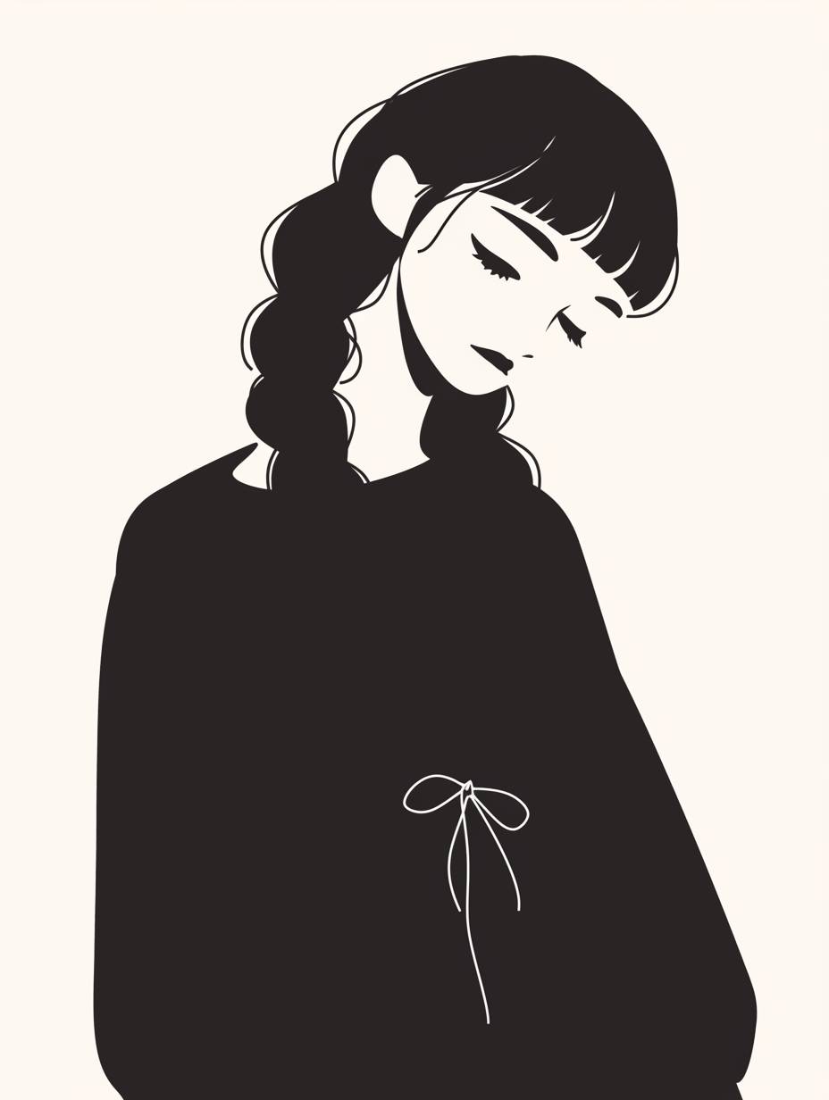 A cute woman with long hair in pigtails, wearing an oversized black top and a thin ribbon tied around her neck, depicted as a hand-drawn minimalist vector illustration with a white background. The artwork is simple yet charming, capturing the essence of minimalism while showcasing unique features like the braided hairstyle and the bow on her chest. It's created using clean lines and subtle details to emphasize simplicity over detail. --ar 3:4 --niji 6