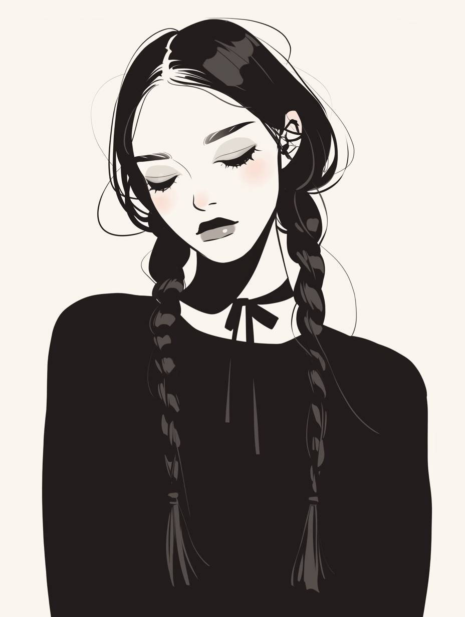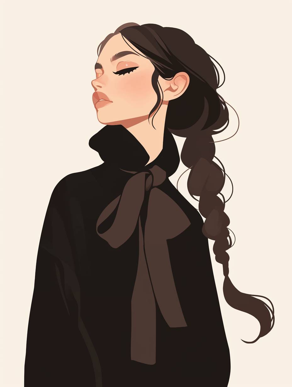 A cute woman with long hair in pigtails, wearing an oversized black top and a thin ribbon tied around her neck, depicted as a hand-drawn minimalist vector illustration with a white background. The artwork is simple yet charming, capturing the essence of minimalism while showcasing unique features like the braided hairstyle and the bow on her chest. It's created using clean lines and subtle details to emphasize simplicity over detail.