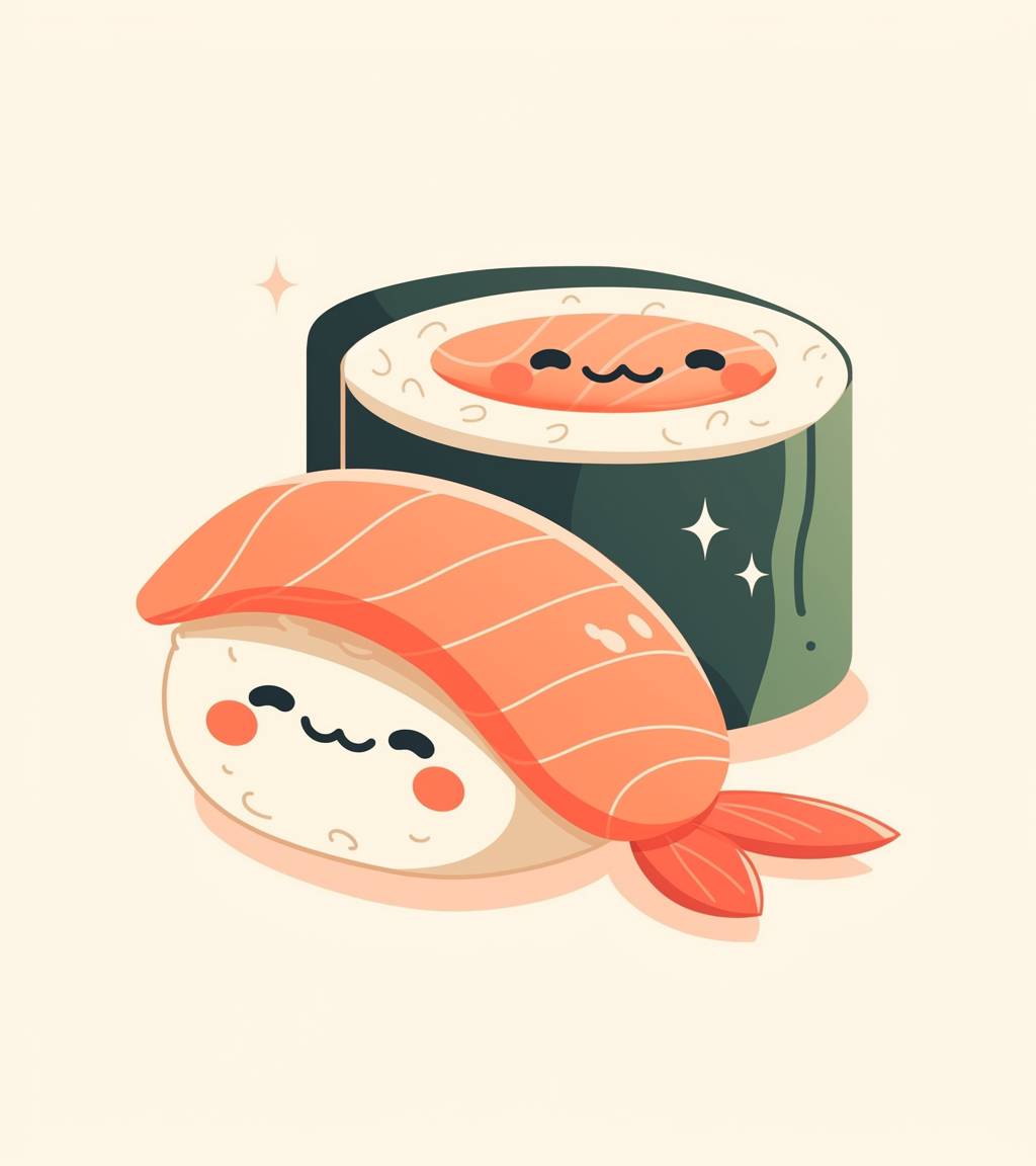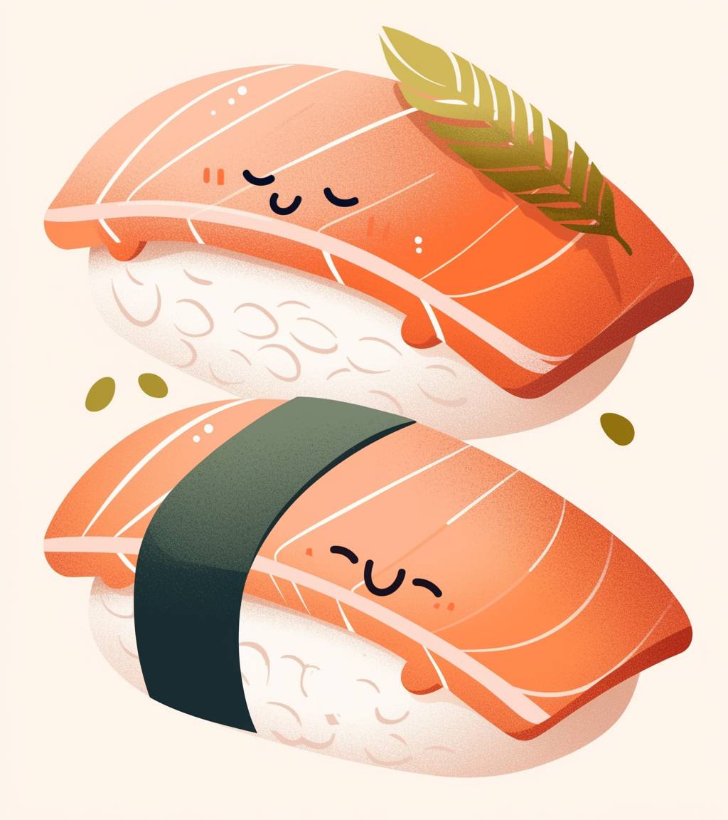 Simple vector illustration of two pieces of sushi with smiling faces. One piece has pink salmon, and the other has a green seaweed leaf on it. Simple line art, flat design, no background, no shadows, pastel colors, low details, cute style, hand-drawn doodle in the style of a small child.