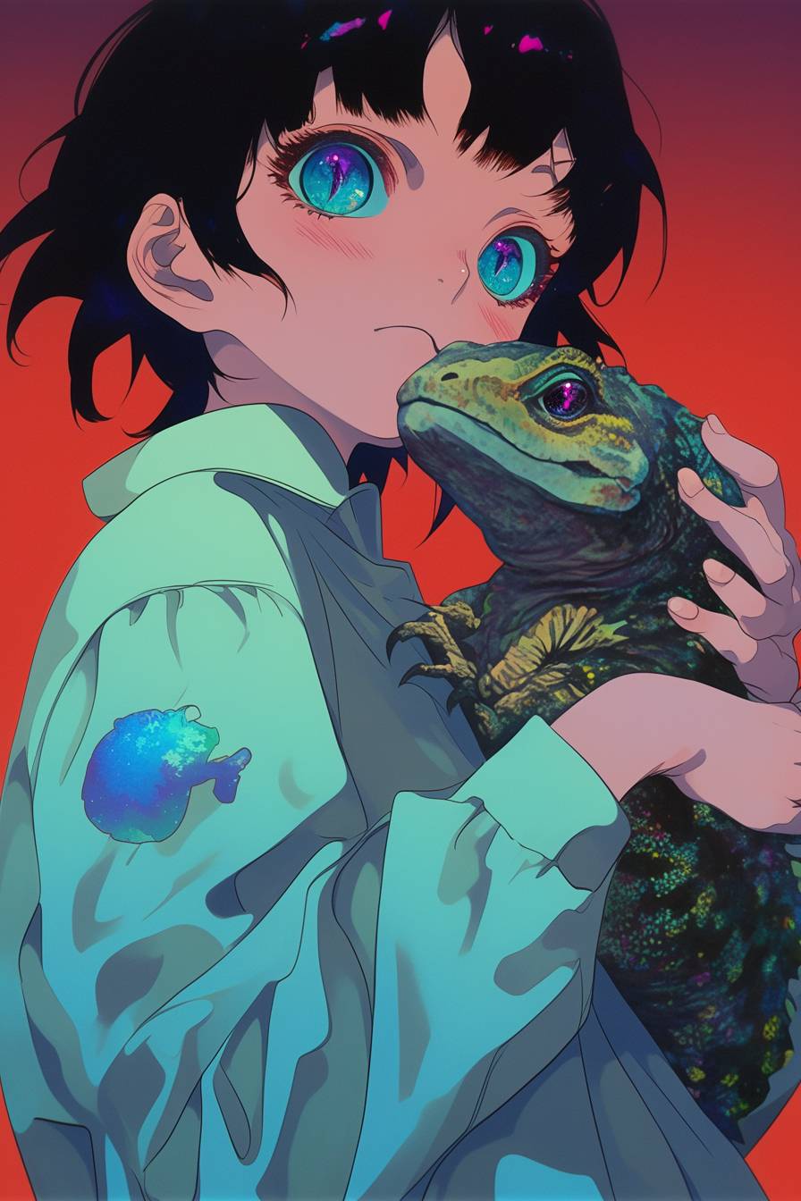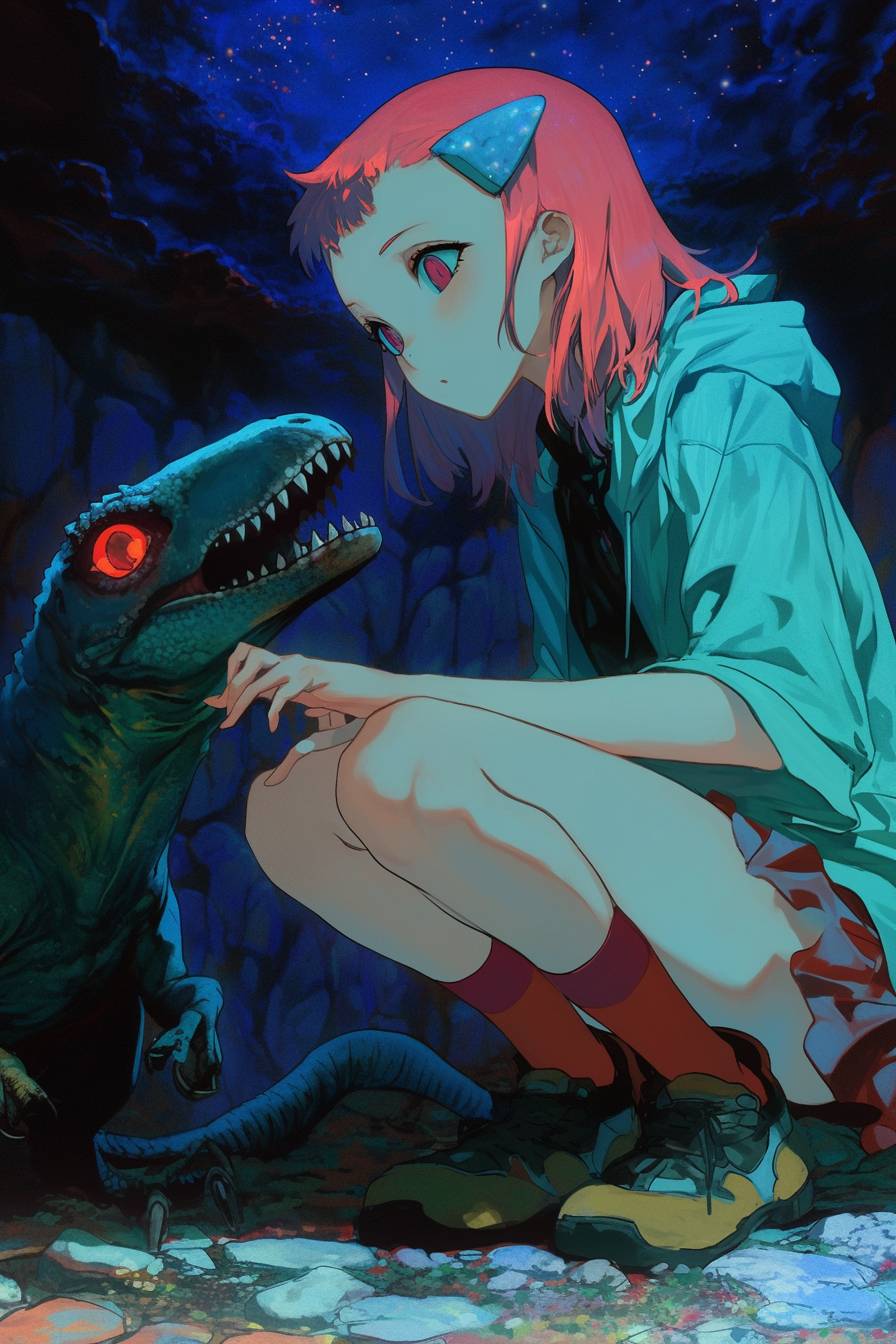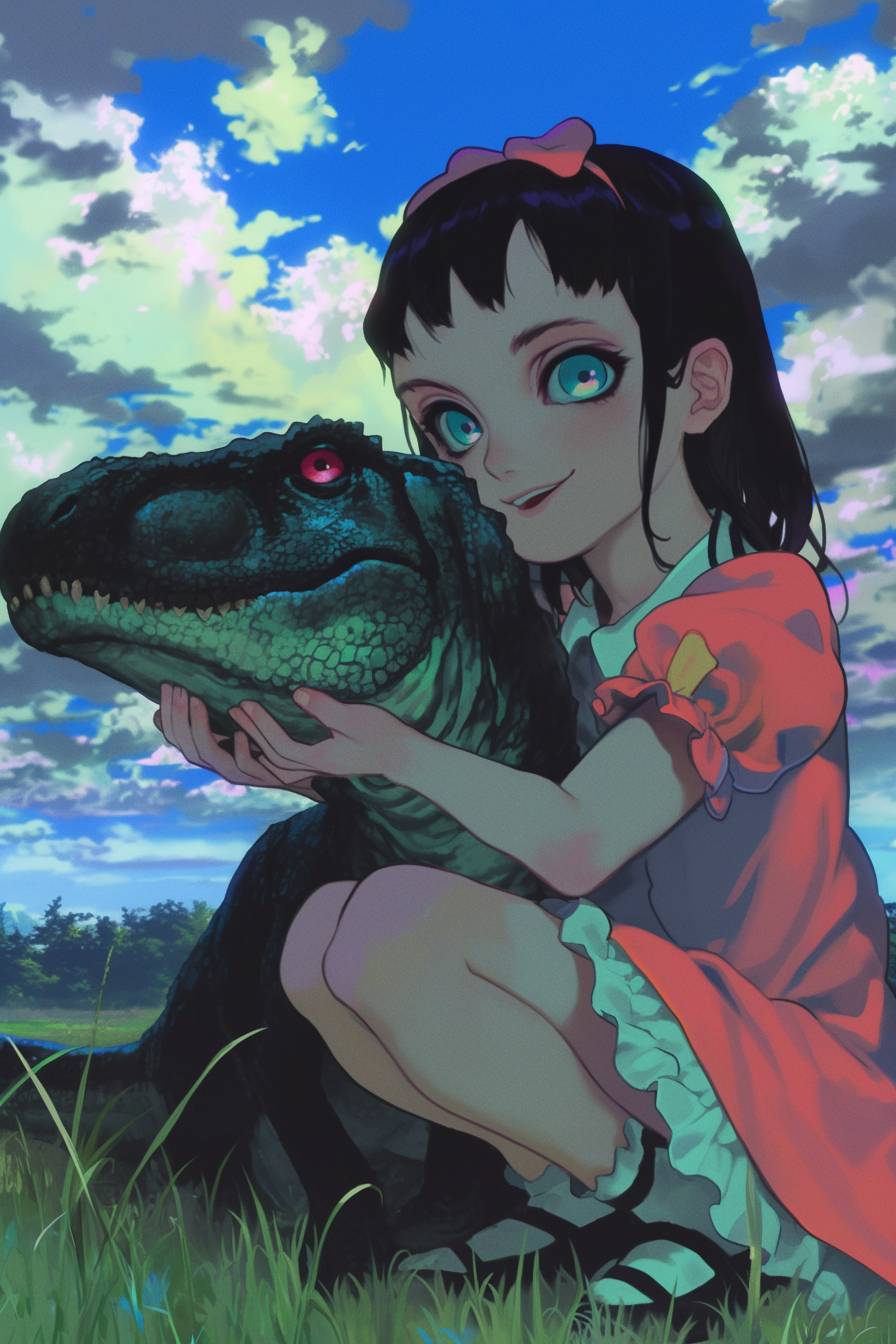 A little girl is raising a small dinosaur.