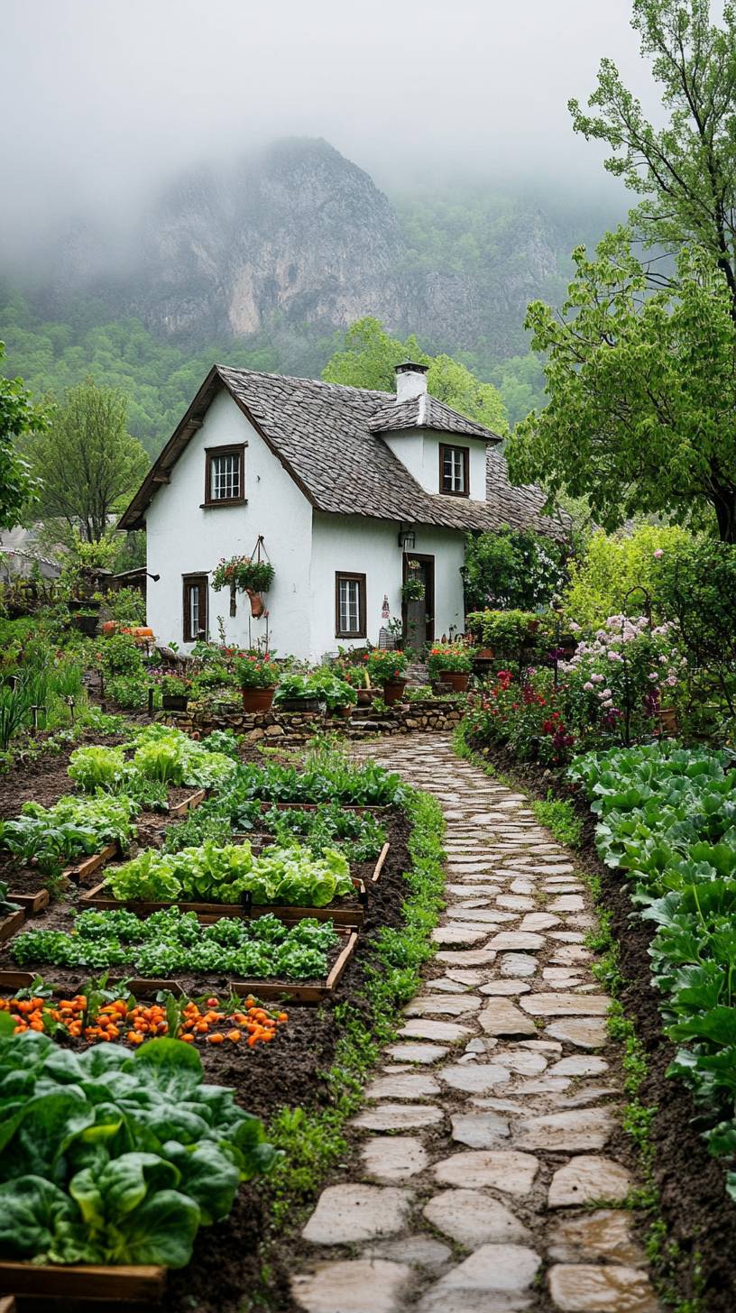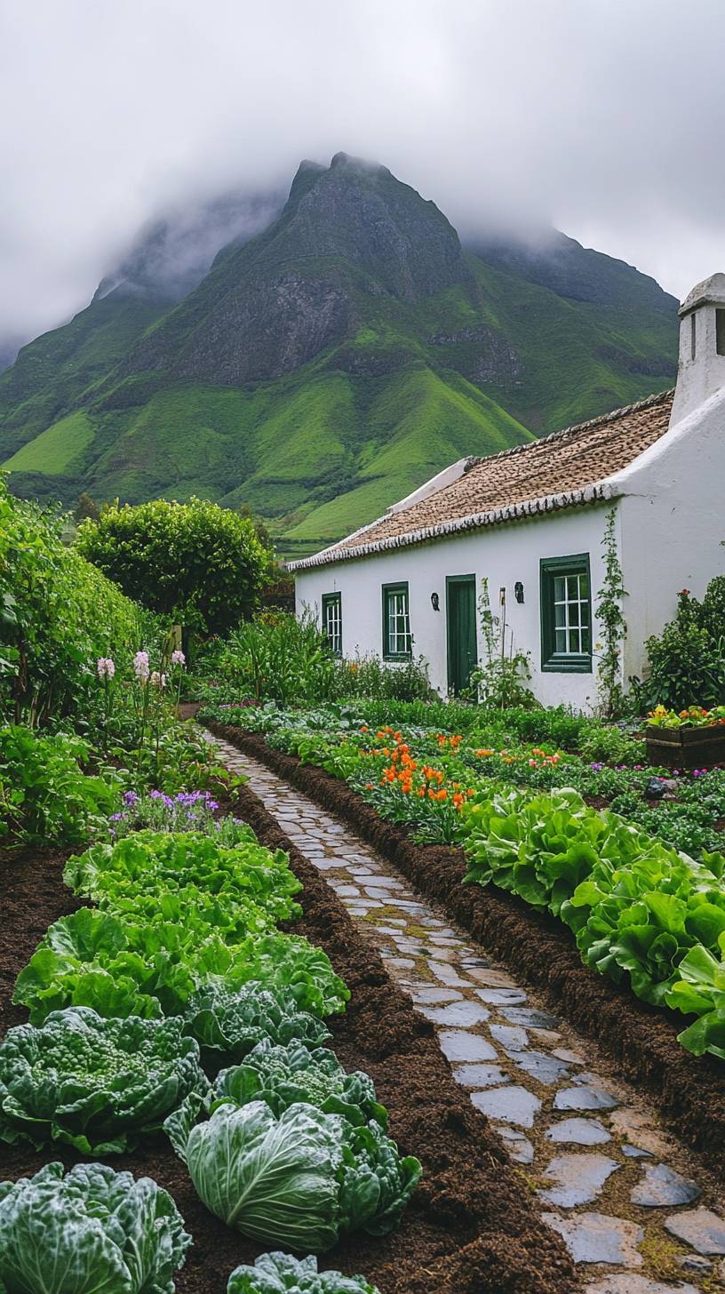 Wow, spring is here. Planting vegetables, backed by a mountain, surrounded by green mist, green and lush. There is a beautiful white house with a thatched roof, a small vegetable garden with many vegetables, a small path made of bluestone, and colorful flowers blooming under the walls. With an ultra wide angle lens, you can take in a panoramic view. After the rain, the clean and tidy countryside courtyard is captured in ultra-high definition, which is clear and realistic --ar 9:16 --stylize 250 --v 6.1