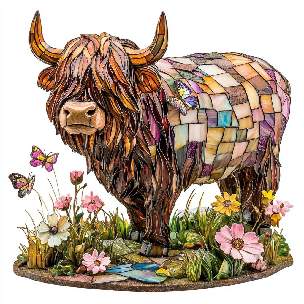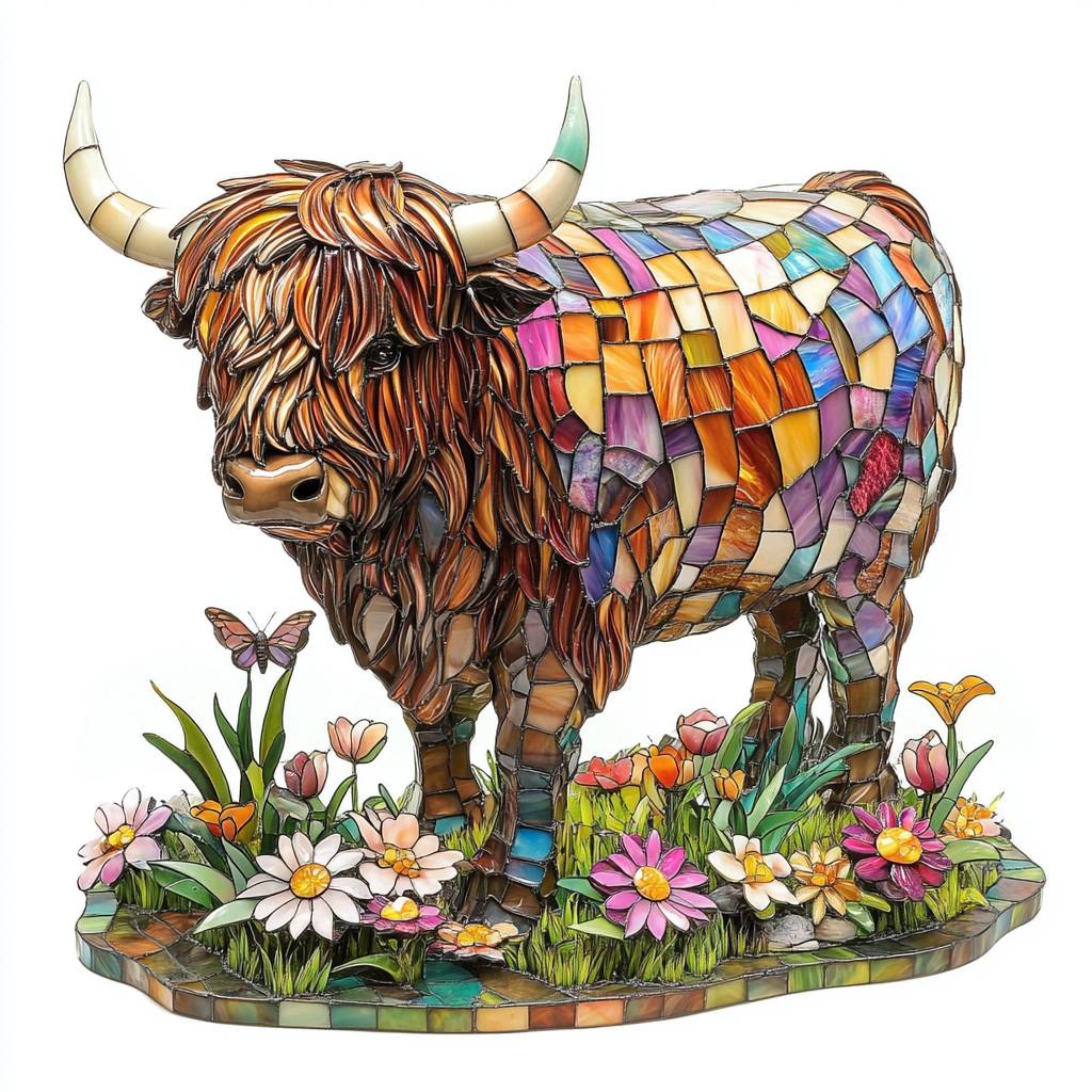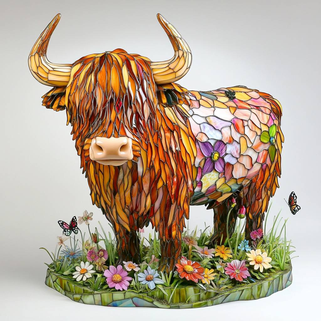 This is a vibrant 3D stained glass sculpture of a Highland cow, capturing the warmth and renewal of spring.