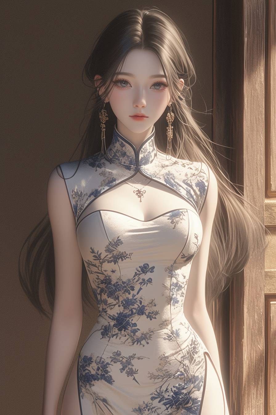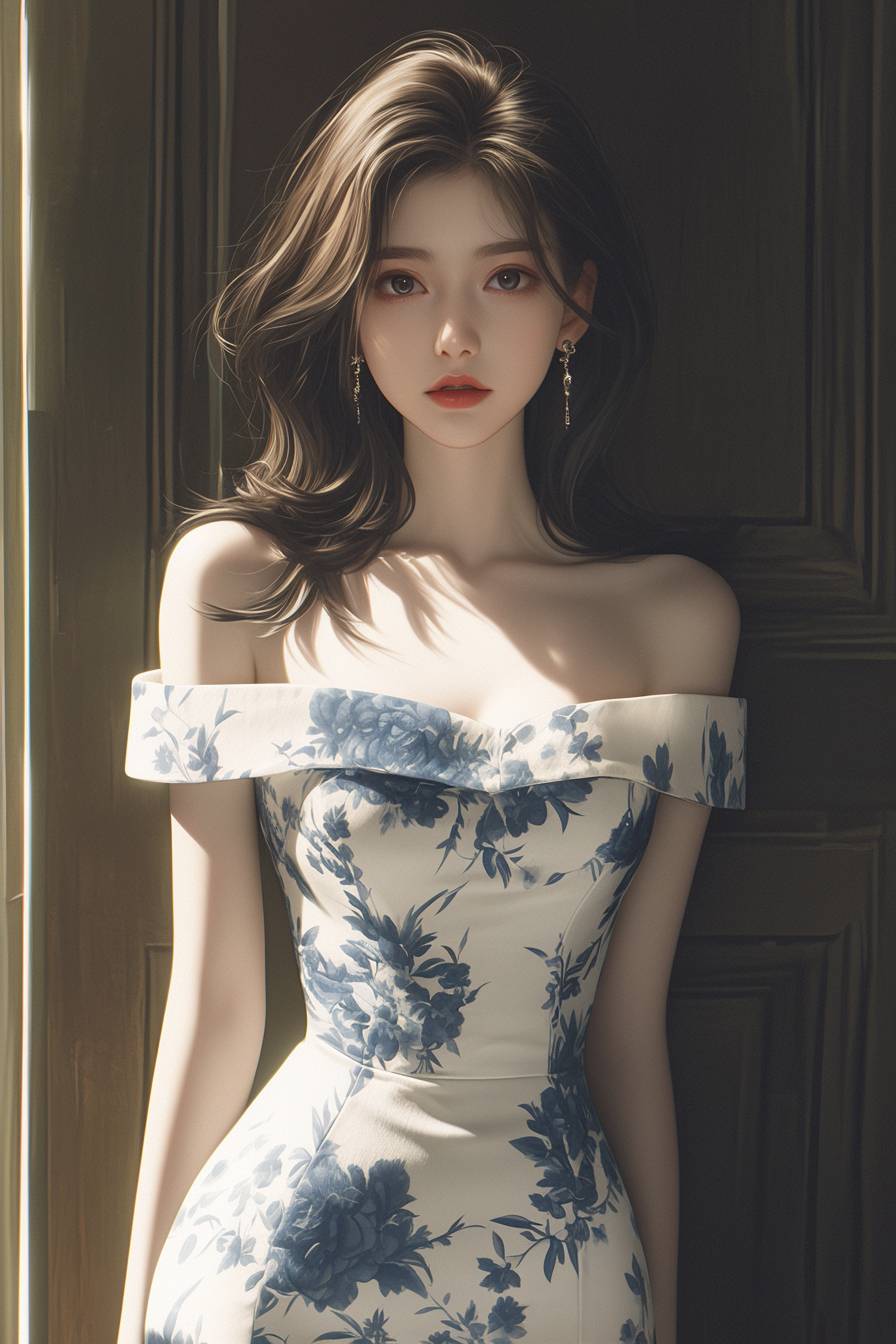 A Chinese beauty stands elegantly at the hotel room door, wearing a white and blue floral dress with an off-shoulder design.