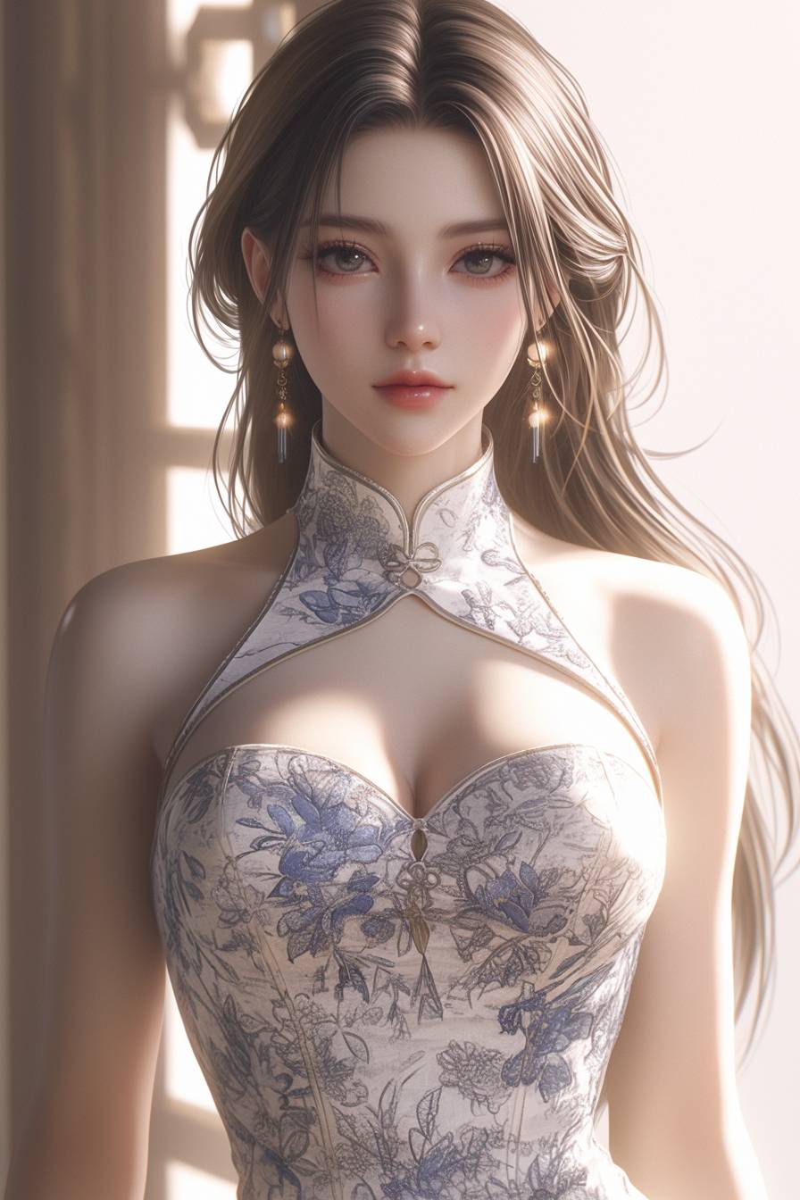Chinese beauty, full body photo, long legs, standing in the hotel room door wearing white and blue floral dress with shoulderless design, elegant posture, high heels, exquisite makeup, natural light, professional photography, super details, high-definition, soft light, 8K, octane render, cinematic, hyper detailed, ultra photorealistic, hyper realistic --ar 85:128 --stylize 1000 --niji 6