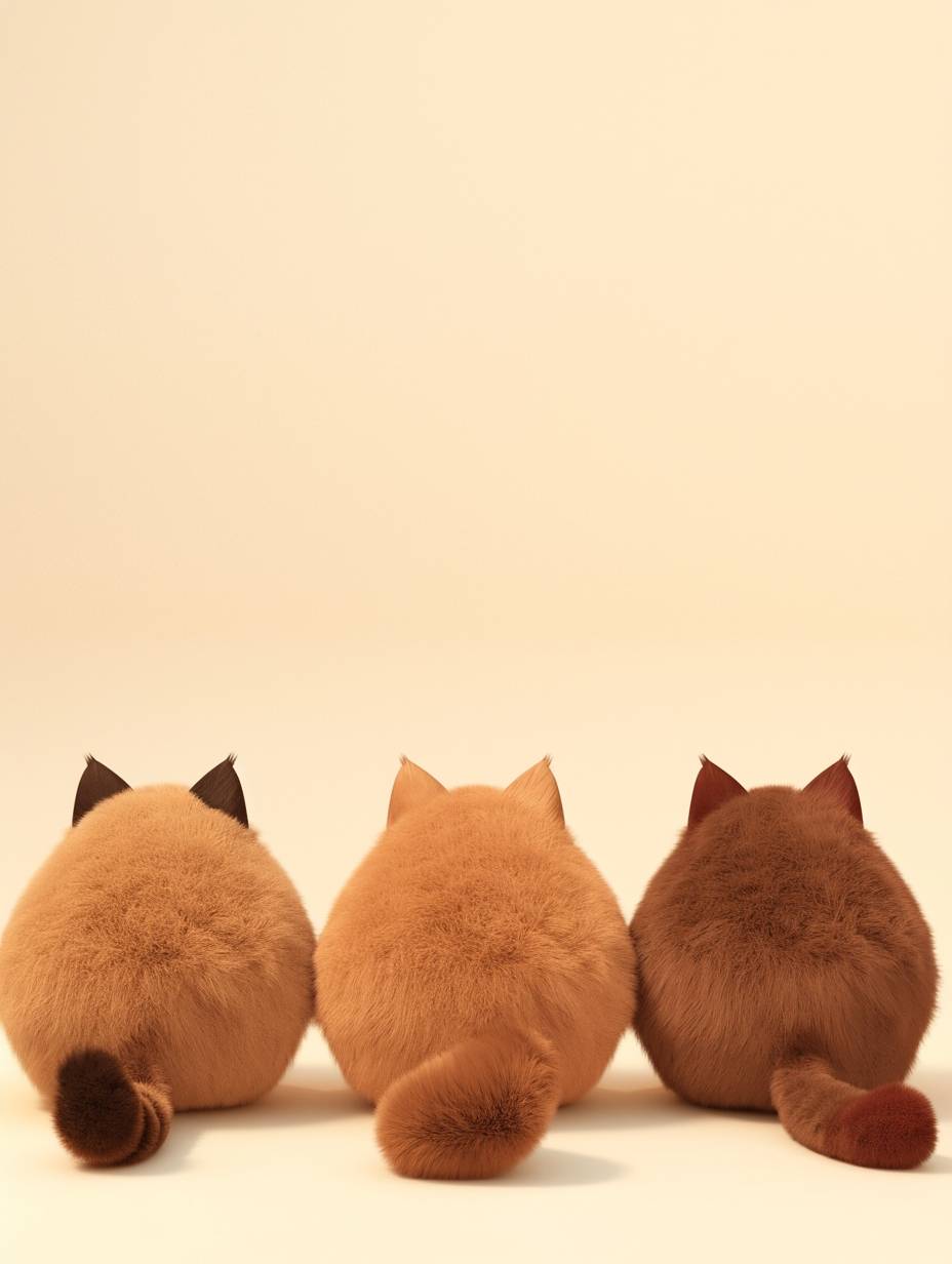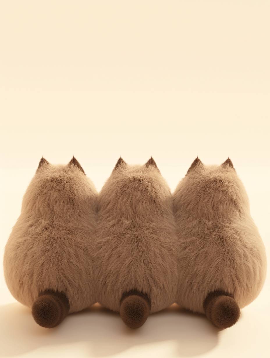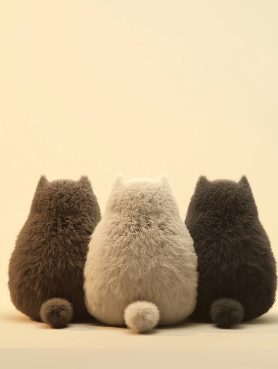 Three cute chubby furry cats, made of 3D furry material, with their backs facing the camera, fluffy tails, and overlapping music. The furry texture is in Pixar style, super fluffy plush style, beautiful plush creation, 3D, Blender simulated plush style, C4D simulated plush style, minimalism, Canon camera, studio lightin, --ar 3:4 --style raw --niji 6
