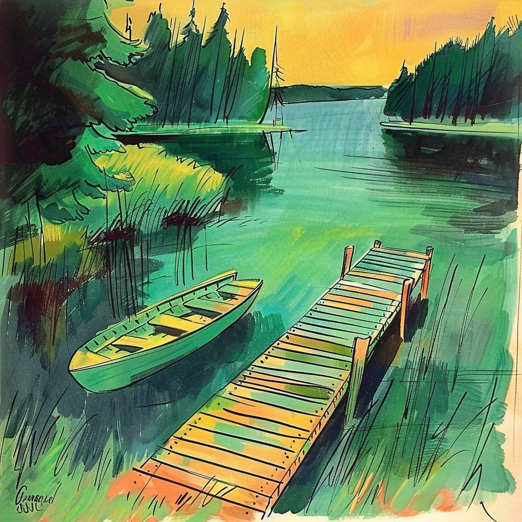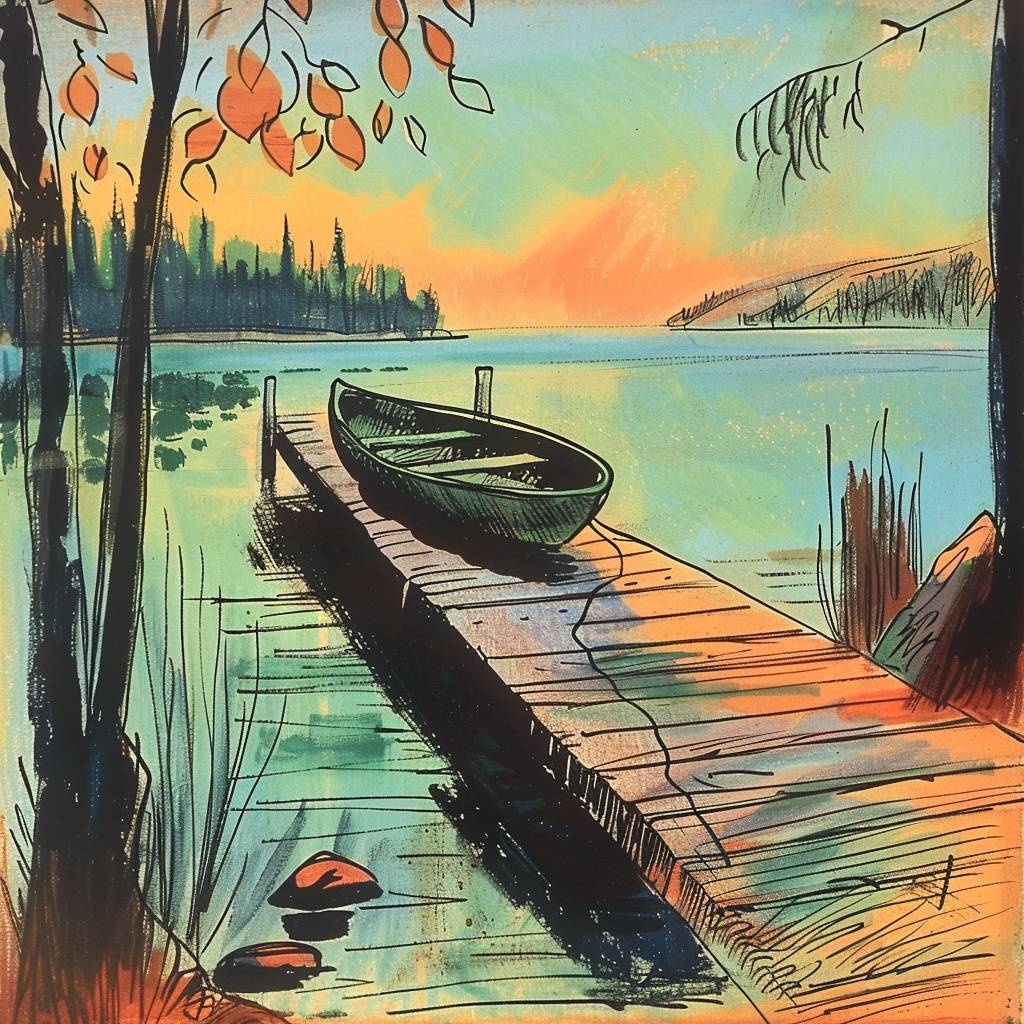 A tranquil lakeside retreat with a wooden dock stretching out into the calm water, where a rowboat bobs gently and the sound of loons calling echoes across the stillness. --sref 1530792017 --chaos 5 --v 6.0
