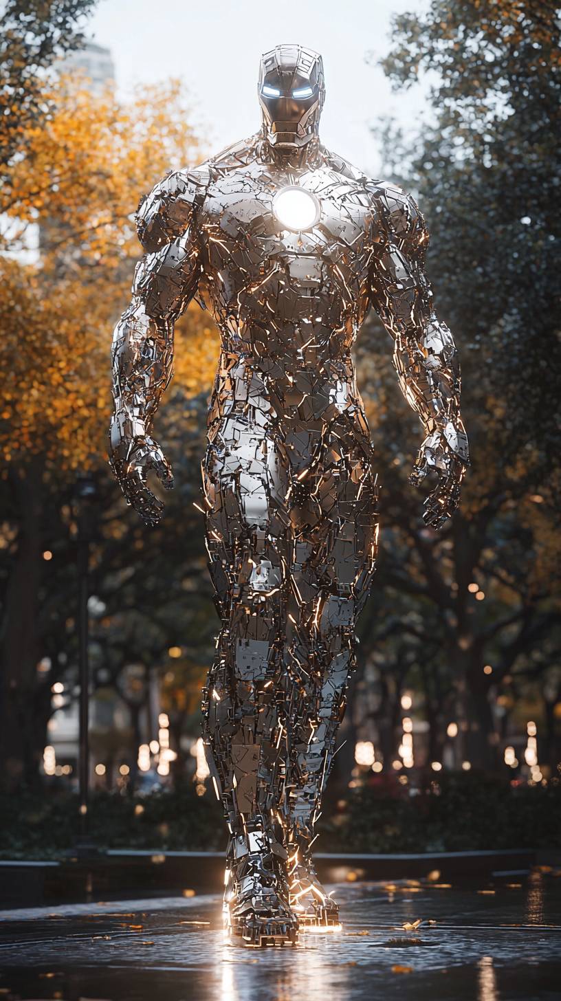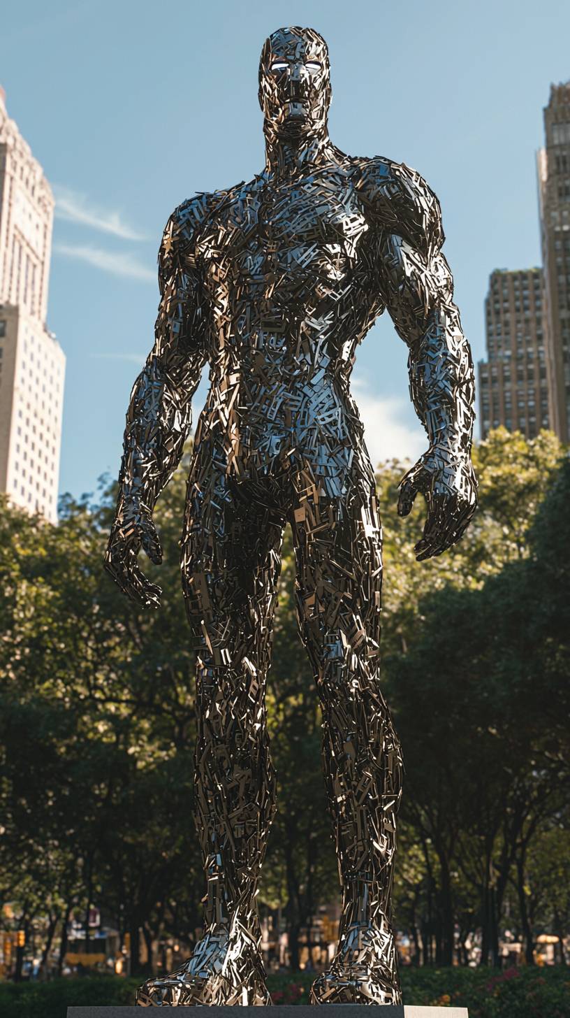 wide perspective, creative, design, UHD, Ominous, Iron-man made of paper clip, bump mapping, as a statue made of paper clip, organics, displacement, gothic sculpture, shape, parallax occlusion mapping, exquisite detailing, ultra details, ultra 16K overall, clean edges, sharpen, translucent, in a central park, hyperrealism, raytracing, vibrant, (Marvel) --ar 9:16 --quality 2 --v 6.1