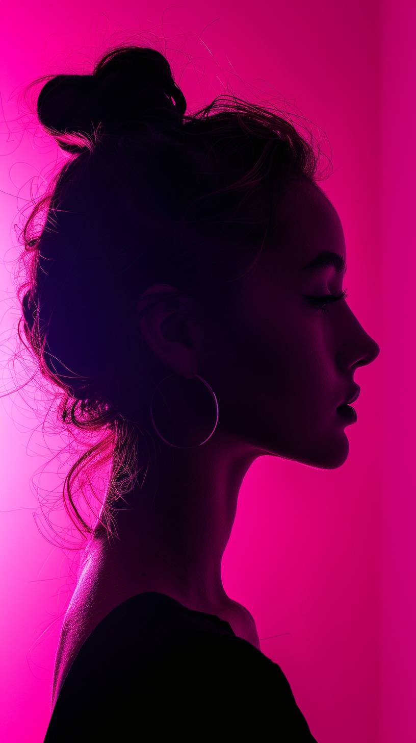 photography, portrait of contrast, profile silhouette of a woman, vibrant hot pink backdrop, visualize using a camera setup that mimics a large aperture, focusing solely on the silhouette's edge, while a low ISO maintains the richness of color without grain, photorealistic, UHD --ar 9:16 --chaos 1.7 --style raw --v 6.0