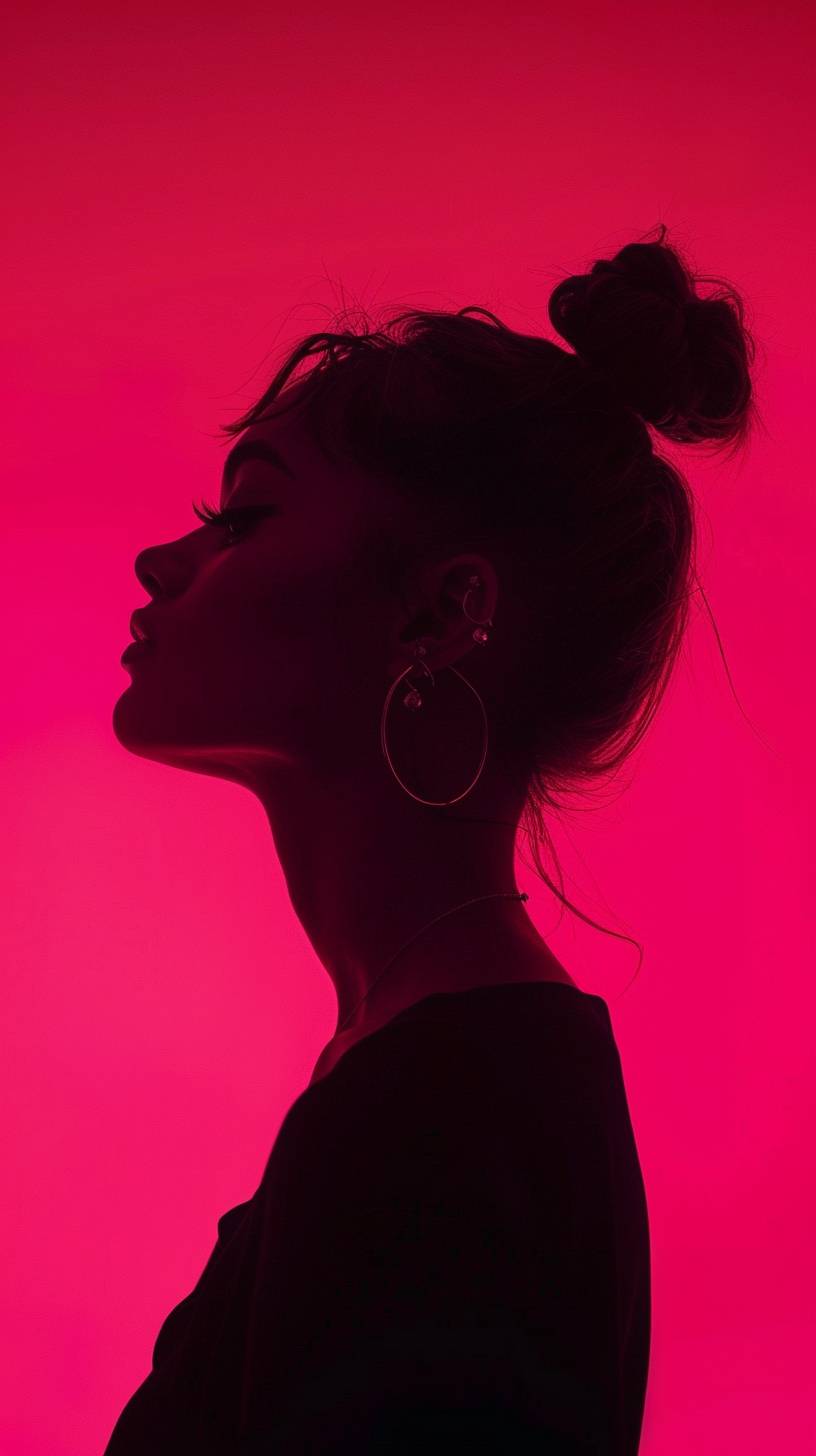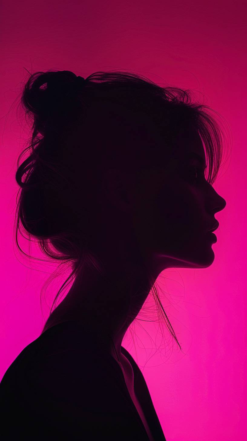 Photography, portrait of contrast, profile silhouette of a woman, vibrant hot pink backdrop, visualize using a camera setup that mimics a large aperture, focusing solely on the silhouette's edge, while a low ISO maintains the richness of color without grain, photorealistic, UHD