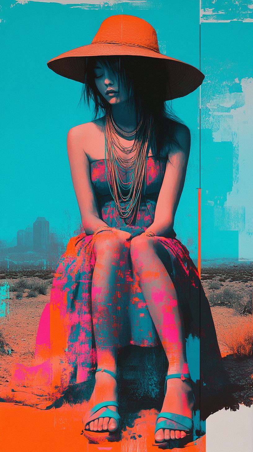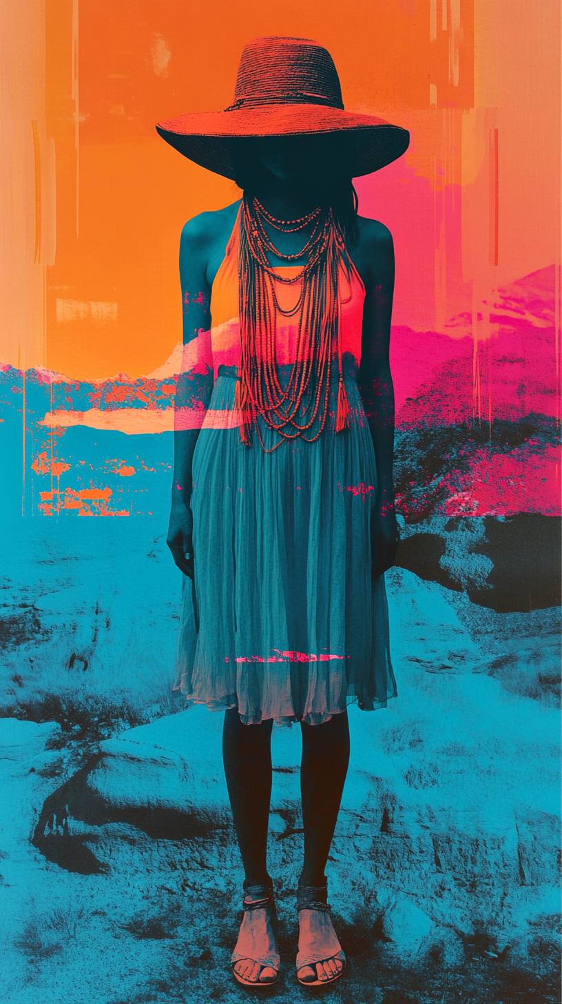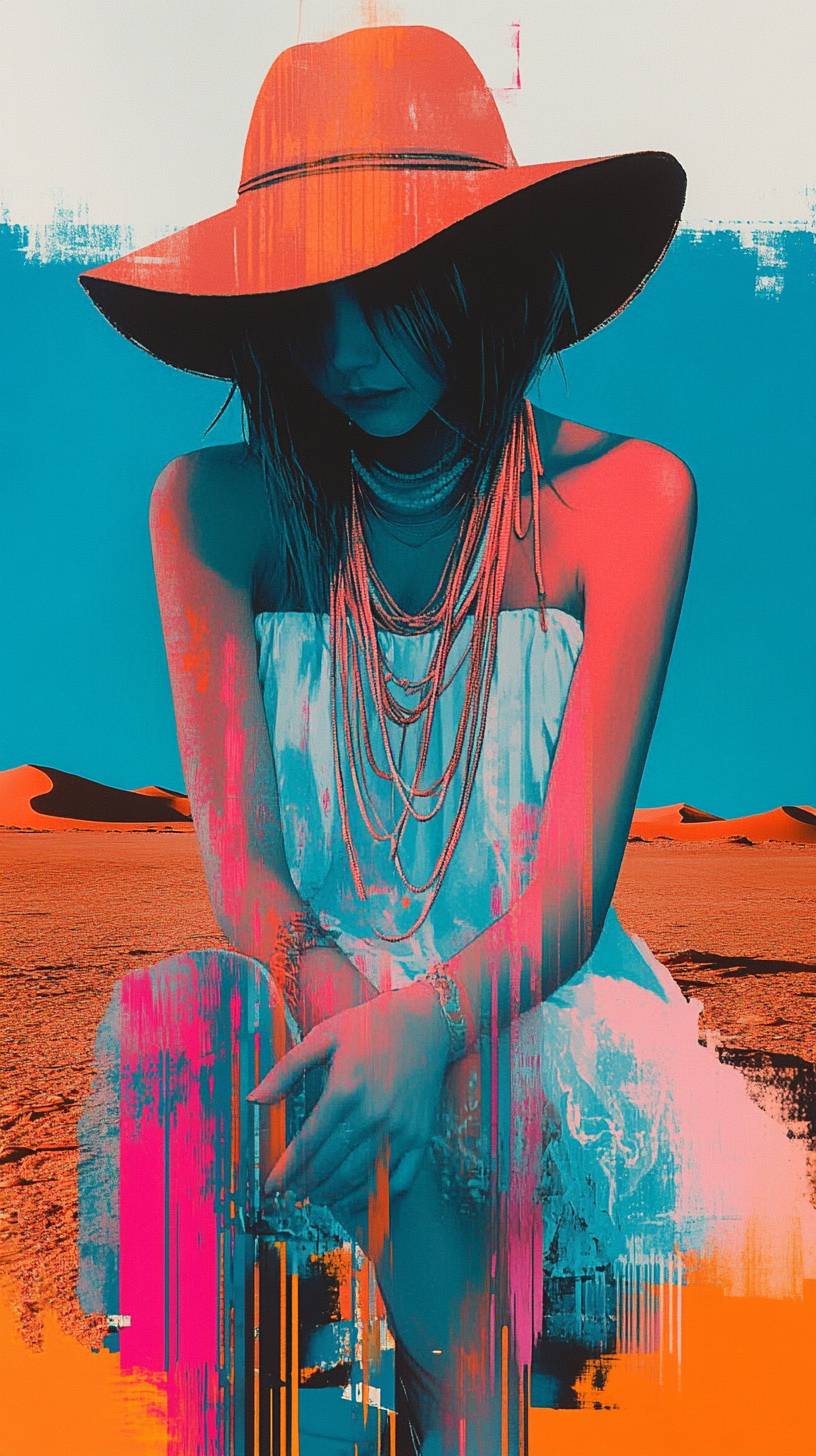 An anime girl in a bohemian flowy dress, floppy hat, layered necklaces, and sandals in a desert setting.