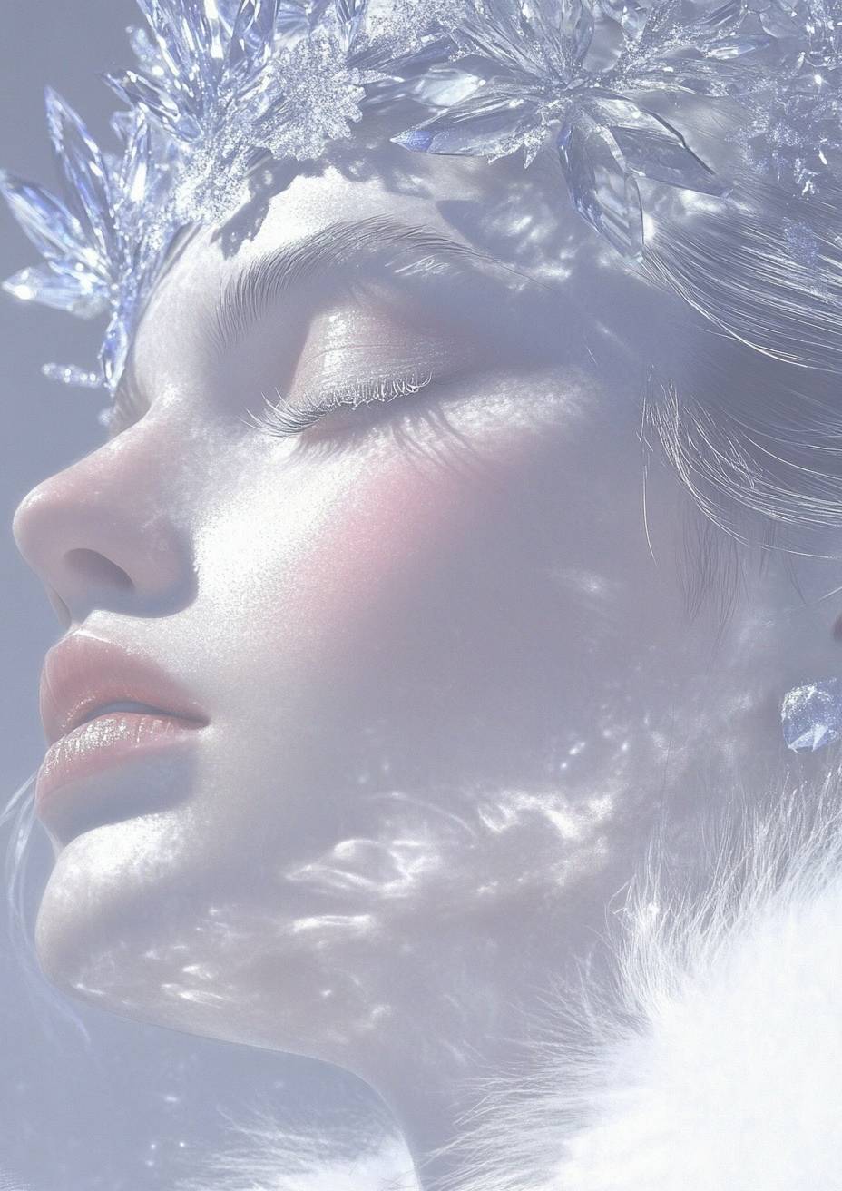 Anime female character, snow queen, white fur coat, crystal crown, ice-themed accessories, winter palace. --sref 4045850692 --ar 5:7