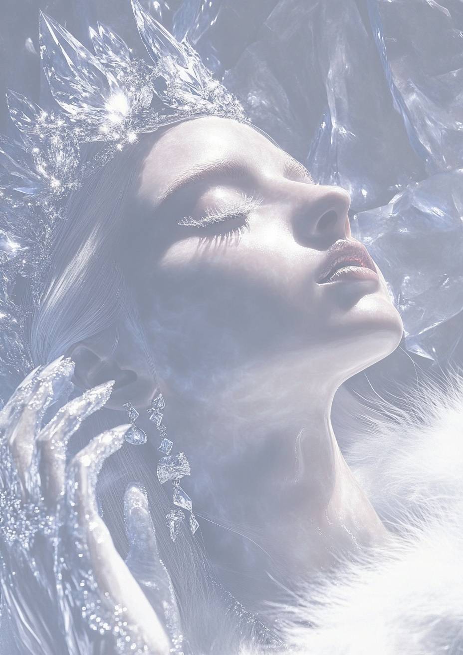 Anime female character, snow queen, wearing a white fur coat, a crystal crown, ice-themed accessories, living in a winter palace.