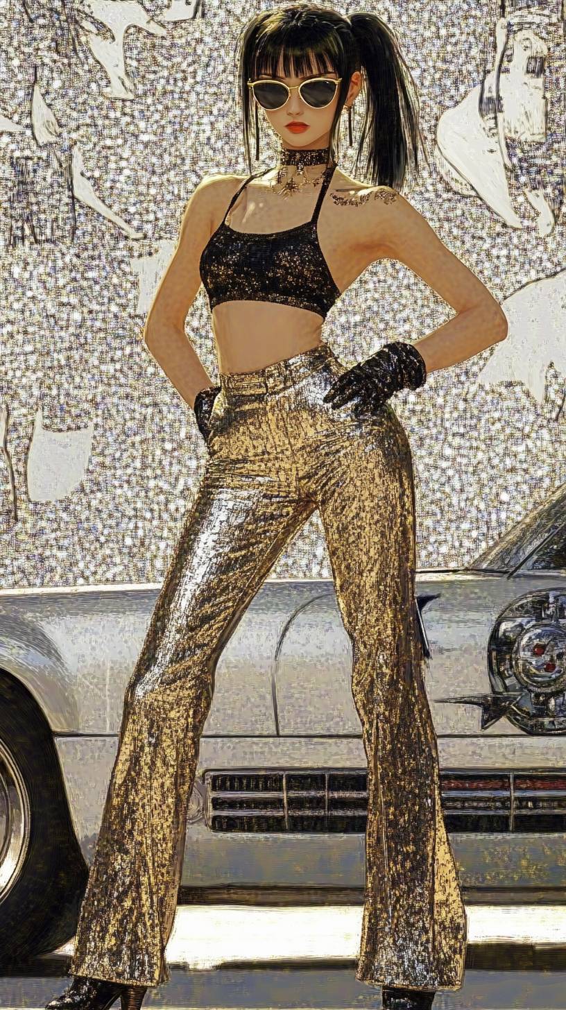 Anime female character, retro chic, high-waisted pants, crop top, cat-eye sunglasses, vintage car.