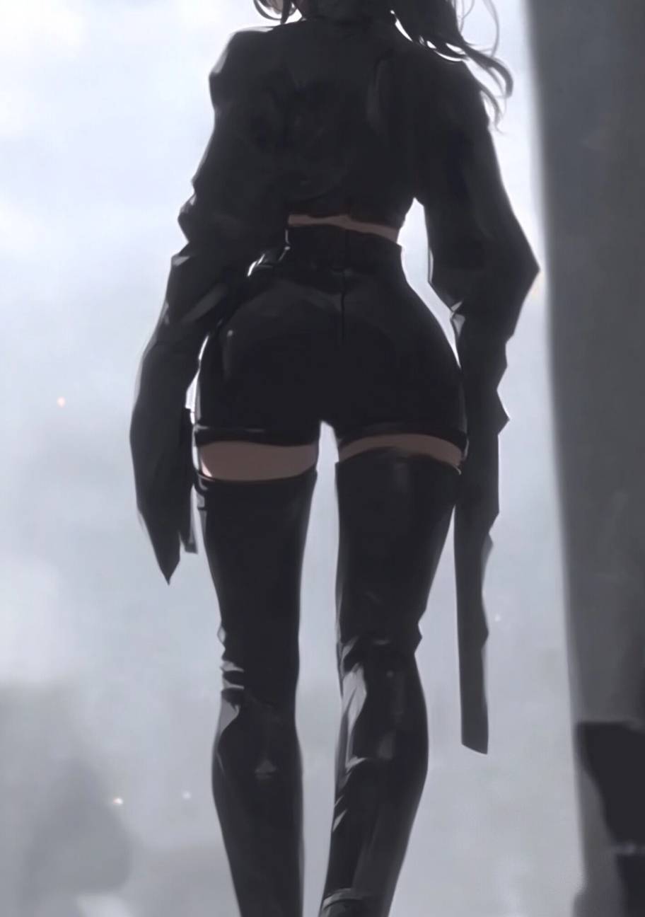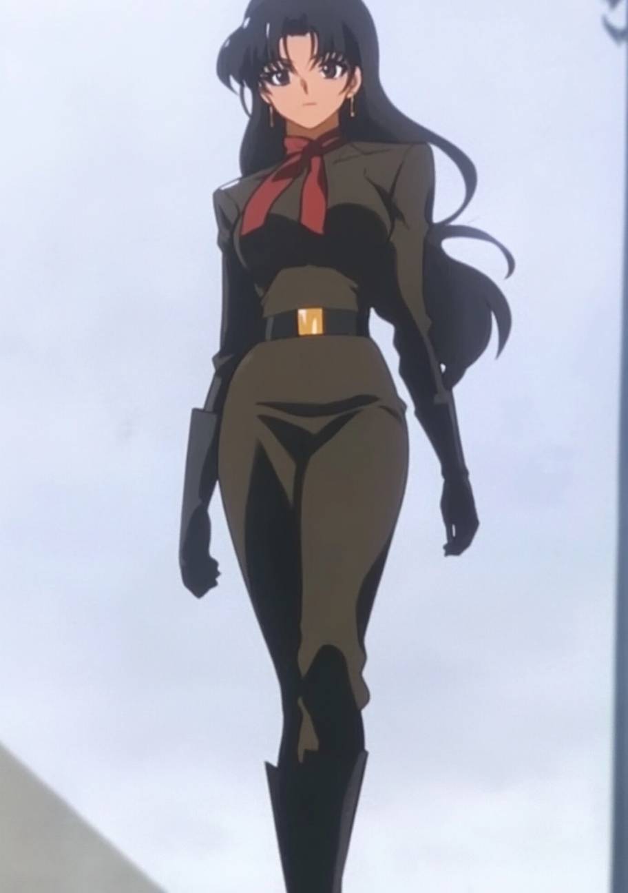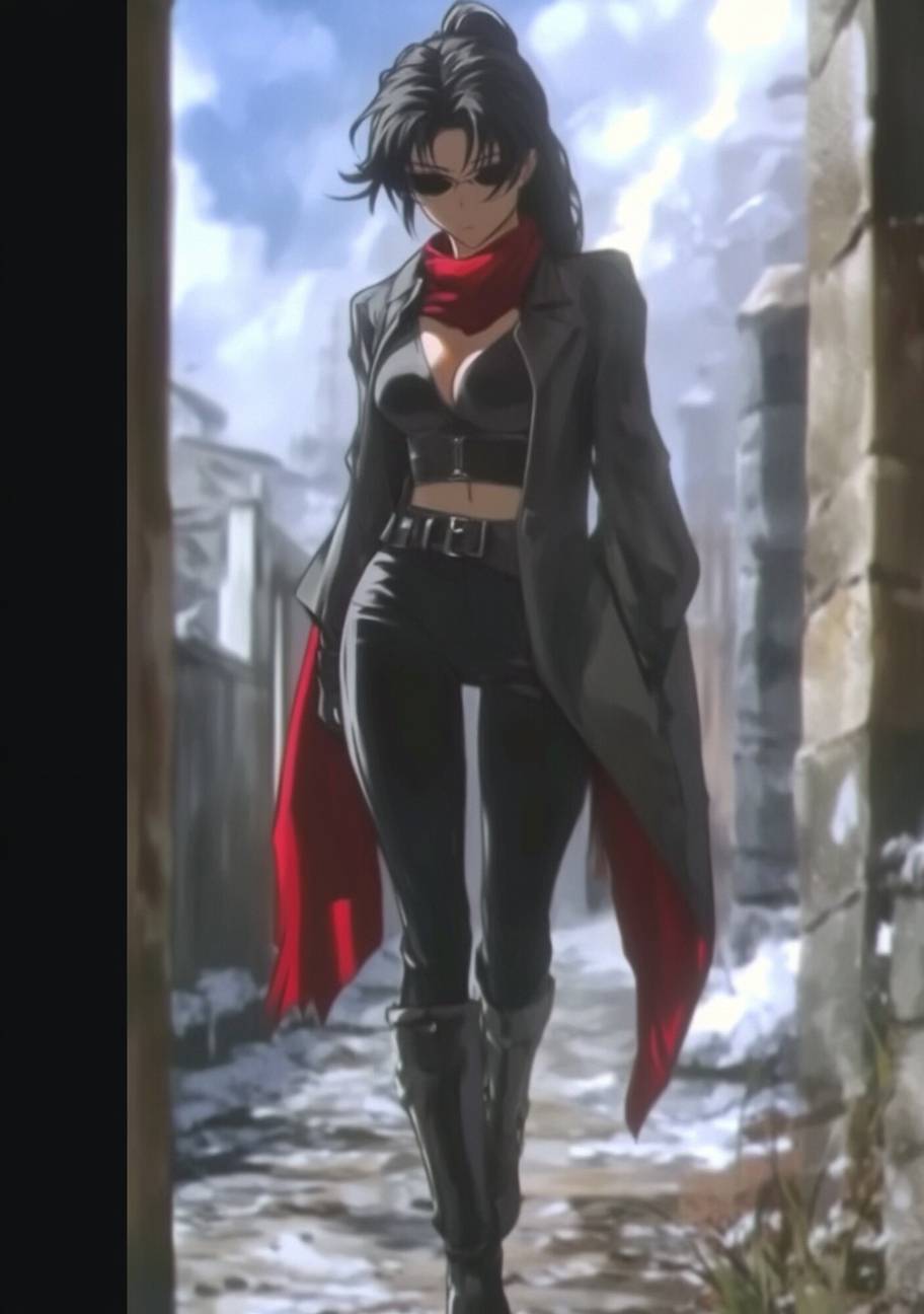 An anime female character in high fashion, wearing a tailored coat, silk scarf, skinny pants, and pointed boots while walking the runway.
