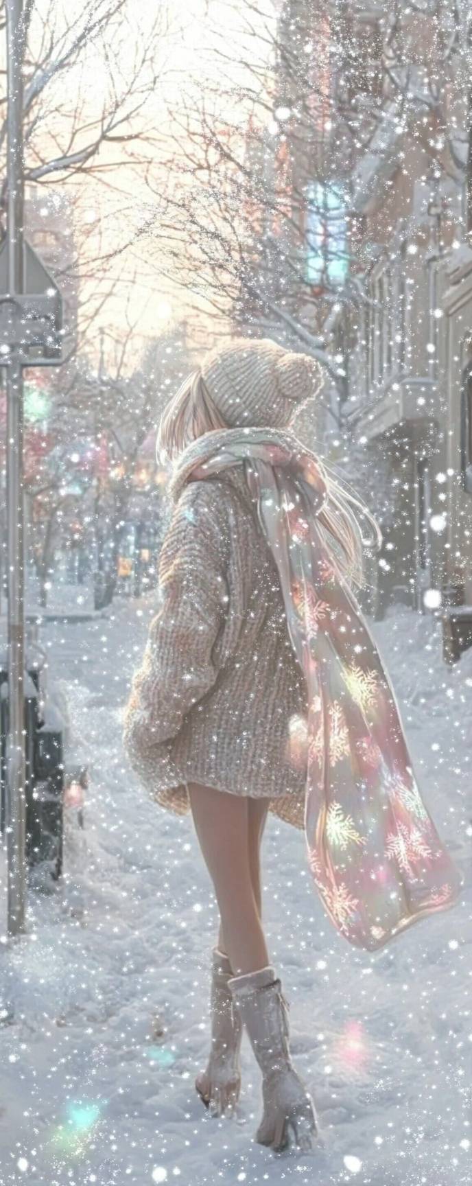 Anime female character, cozy winter, oversized sweater, wool scarf, boots, snow-covered street.