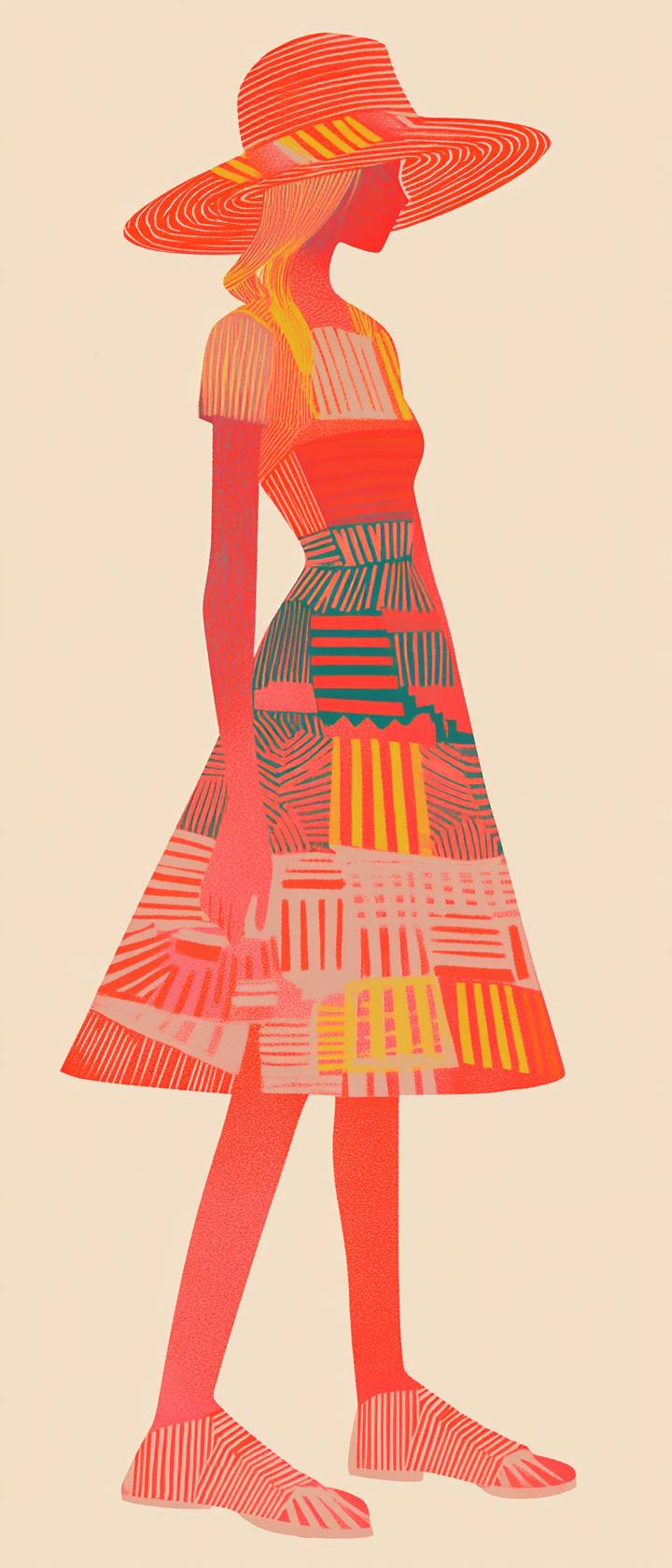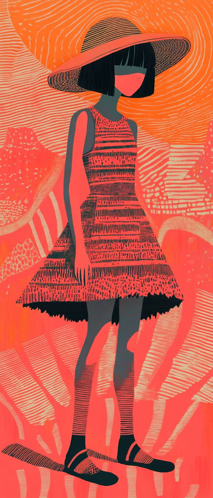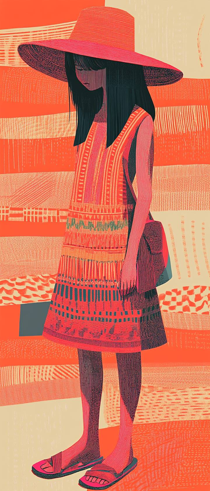 Anime girl, festival style, bohemian dress, floppy hat, sandals, sun-kissed skin, beach vibe.