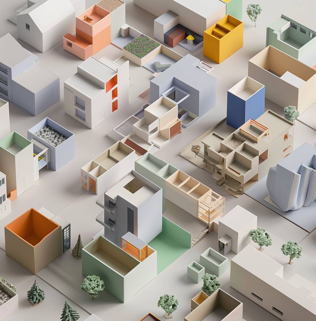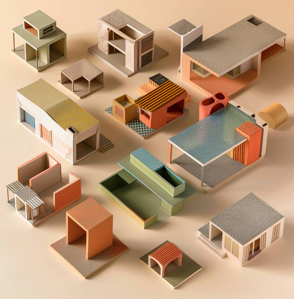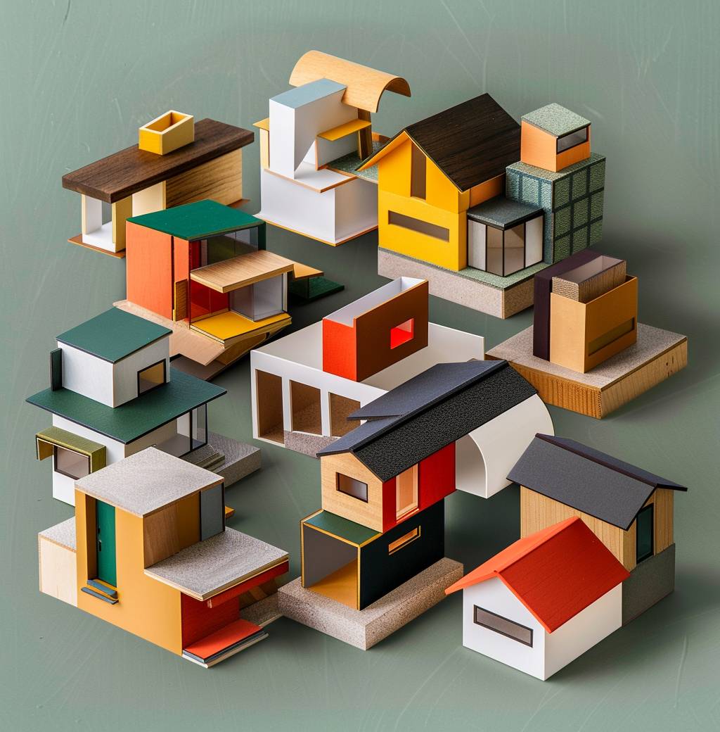 A series of architectural models, each representing different types or styles of houses and buildings, arranged on top of one another to form an overhead view that shows the arrangement in three dimensions. The models include simple square block structures with gable roofs, complex fractal designs, shapes resembling modernist architecture, minimalist lines, and colorful tones, all set against a neutral background. This visual representation highlights how these forms can be combined into unique compositions.