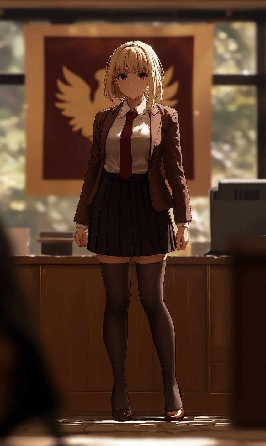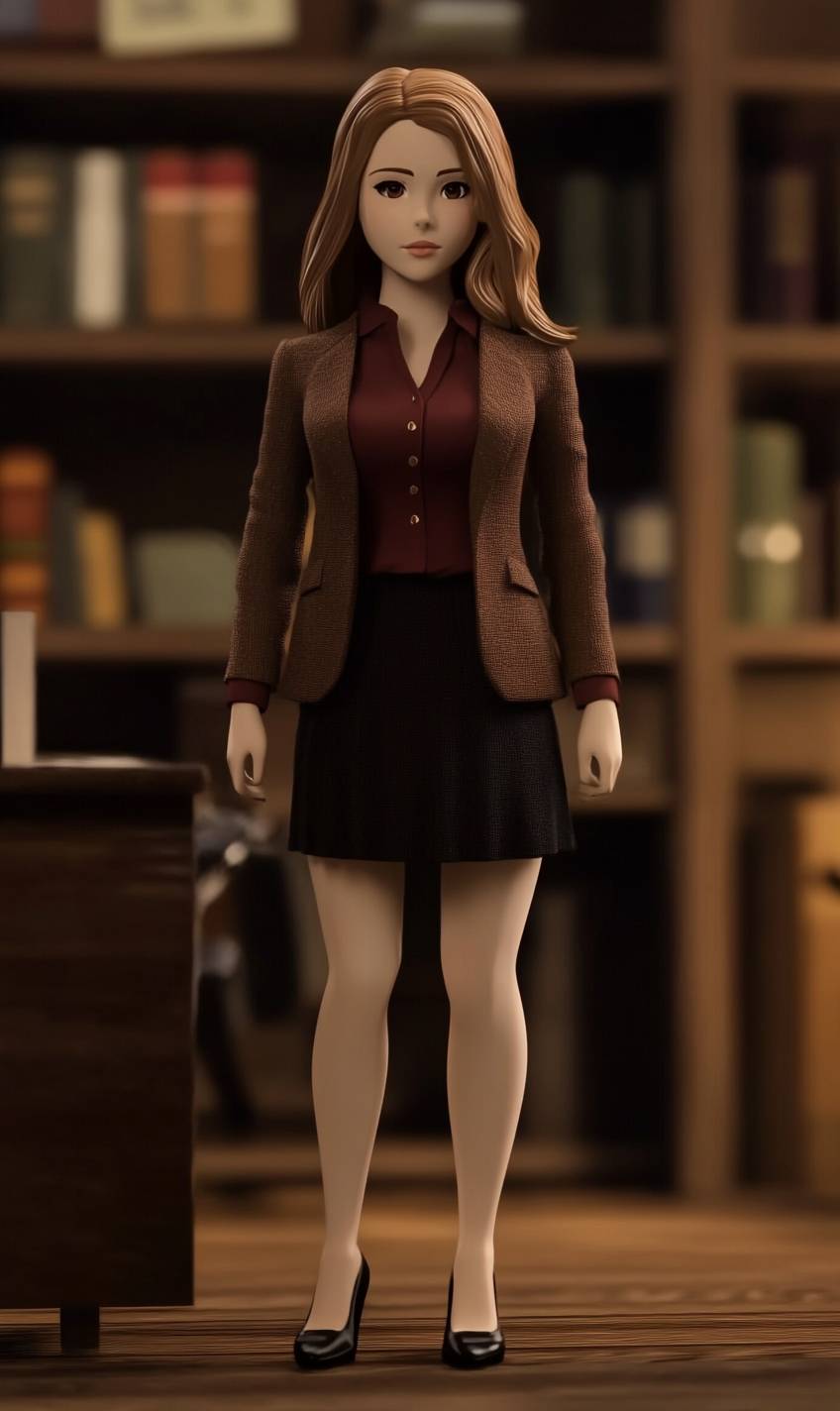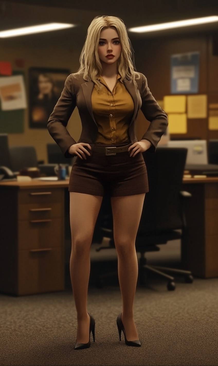 An anime girl in business casual attire, wearing a tailored blazer, silk blouse, pencil skirt, and pointed heels, with an office background.