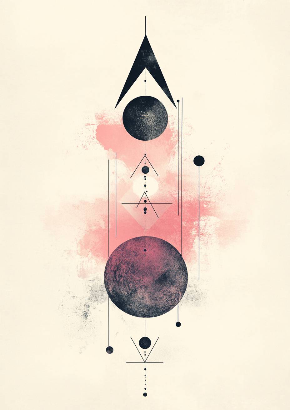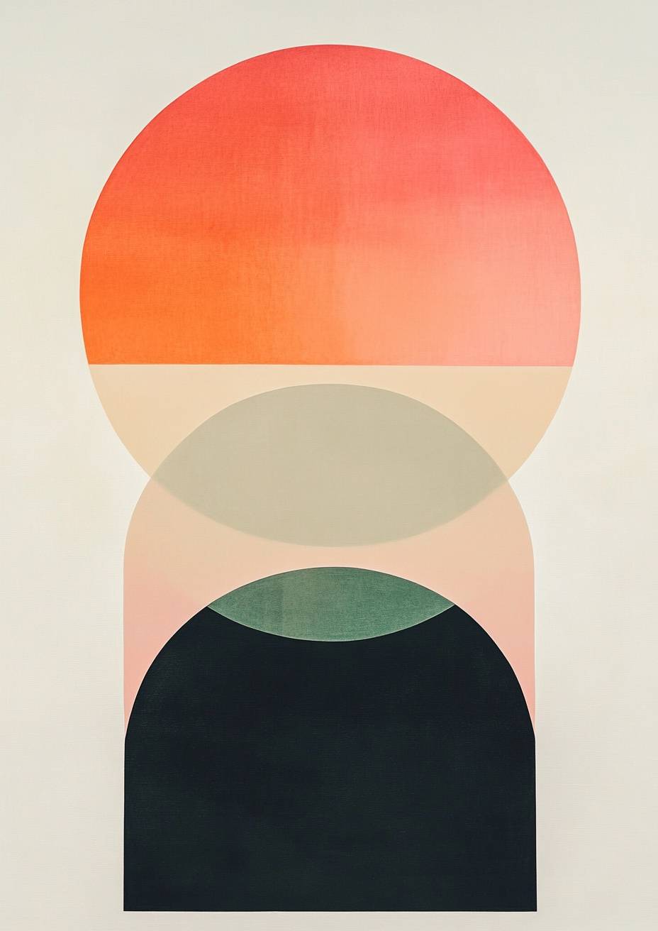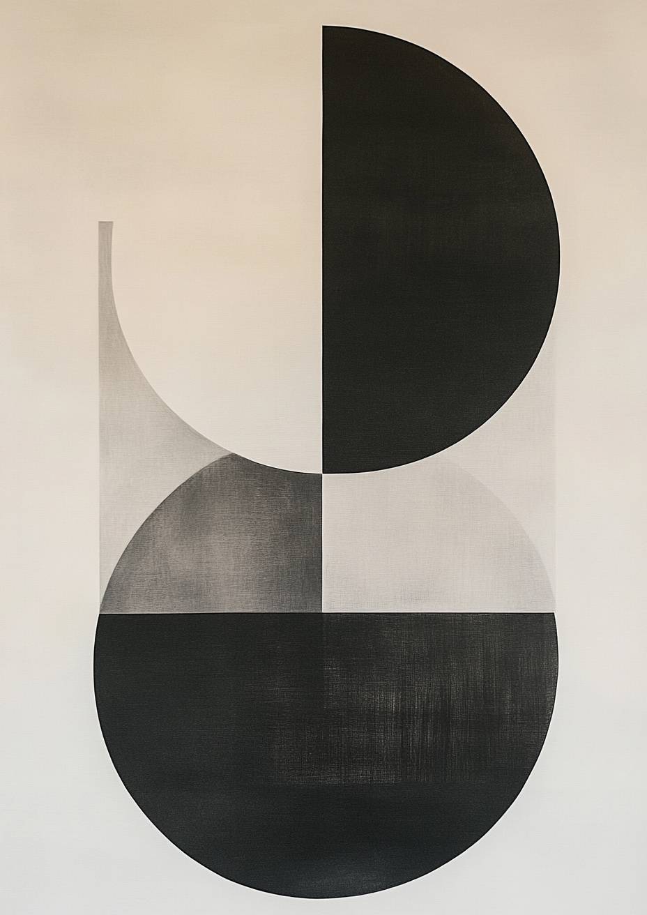 A minimalist geometric harmony depiction emphasizing balanced shapes and symmetry, utilizing a limited color scheme to create calm and order.