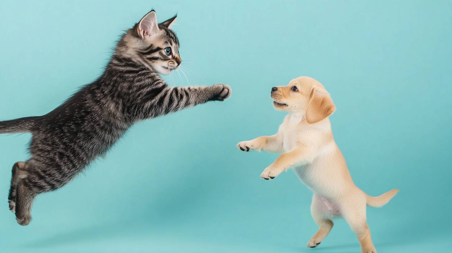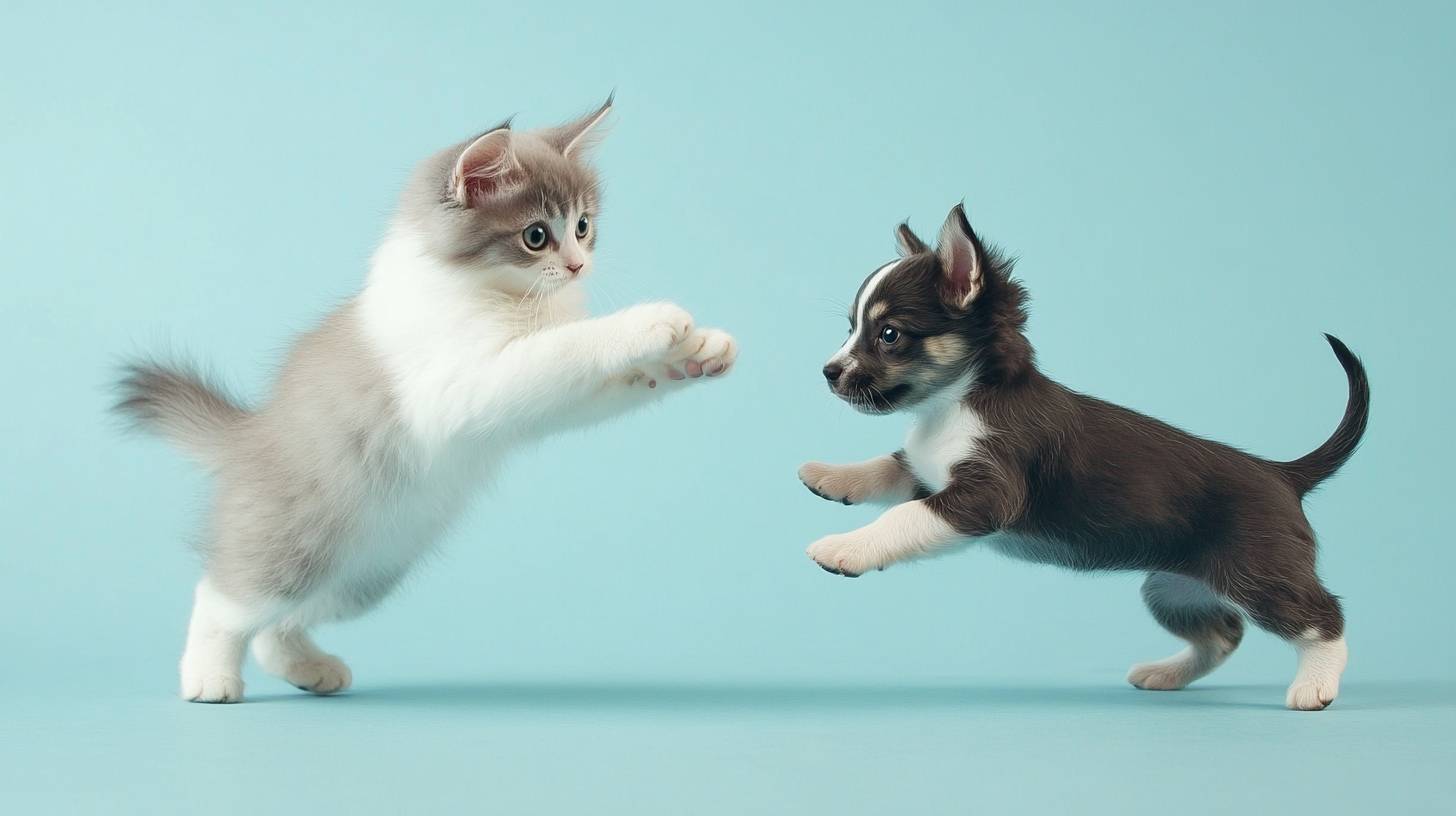 A cat is jumping and playing with a puppy against a light blue background.