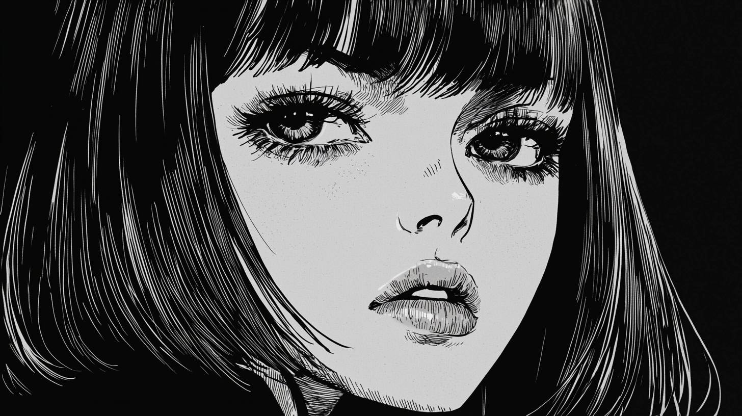 an abstract manga panel of an attractive woman with bangs, very classy. in the style of Junji Ito, with a vintage anime aesthetic, in the style of a vintage Japanese poster. --ar 16:9 --quality 2 --v 6.1