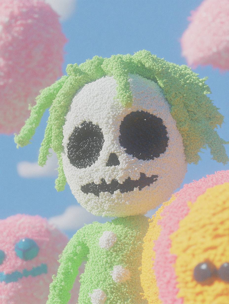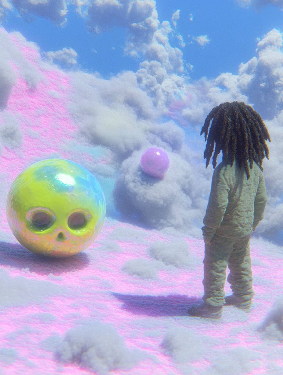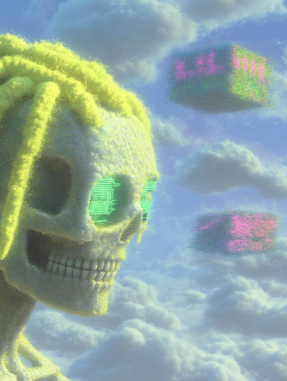 A lonely sad skull figure stands next to a multi-dimensional object amidst a chaotic and orderly futuristic cloud landscape.