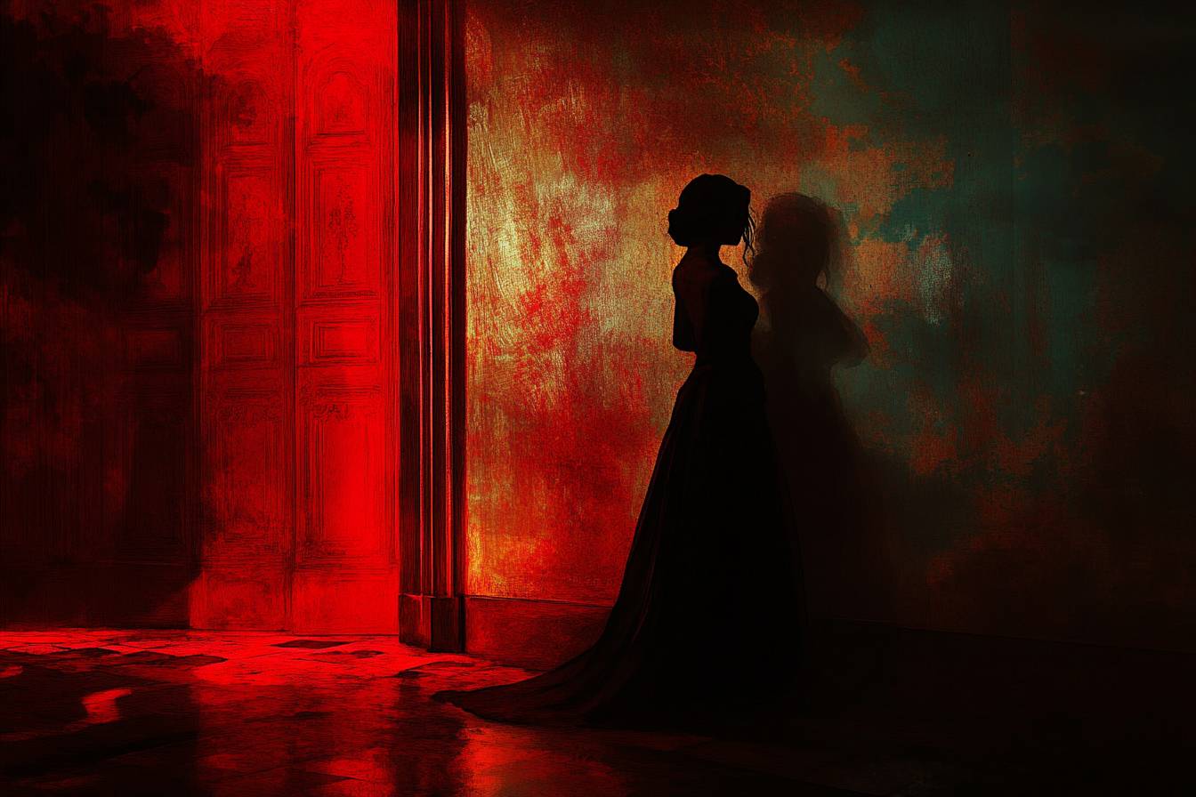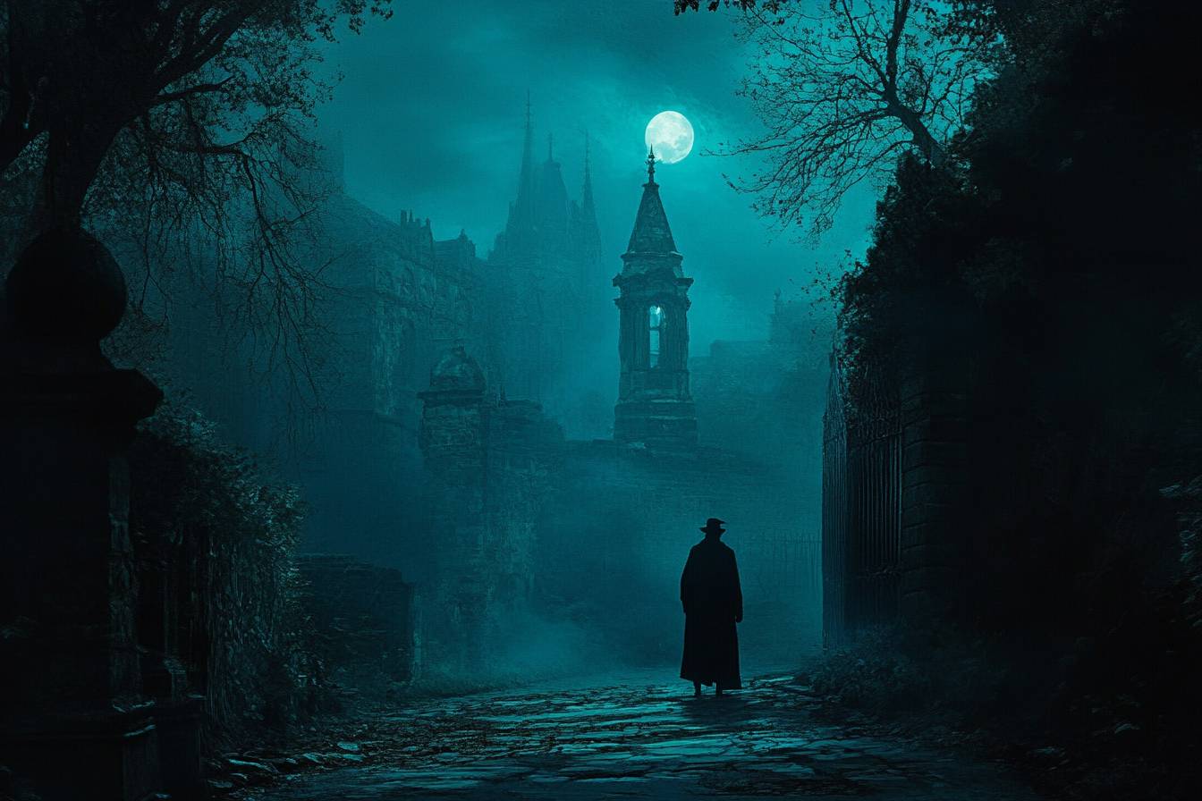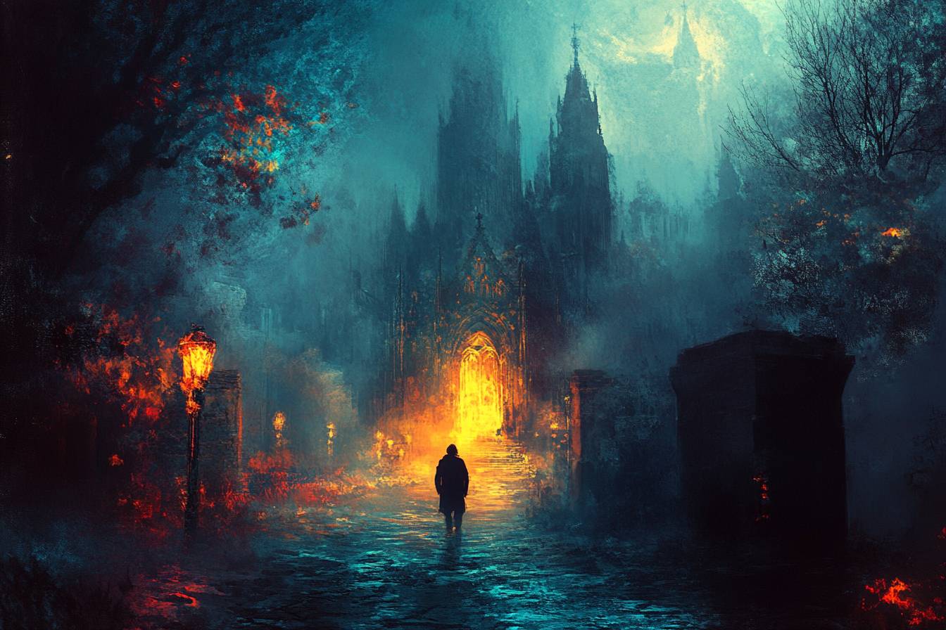 Depicts a mysterious and eerie atmosphere in the style of dark romanticism, with glowing hues and unique lighting effects.