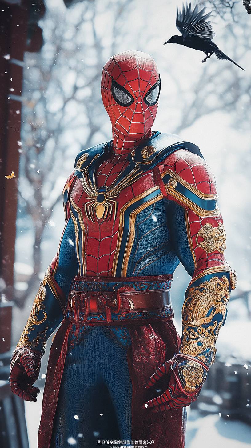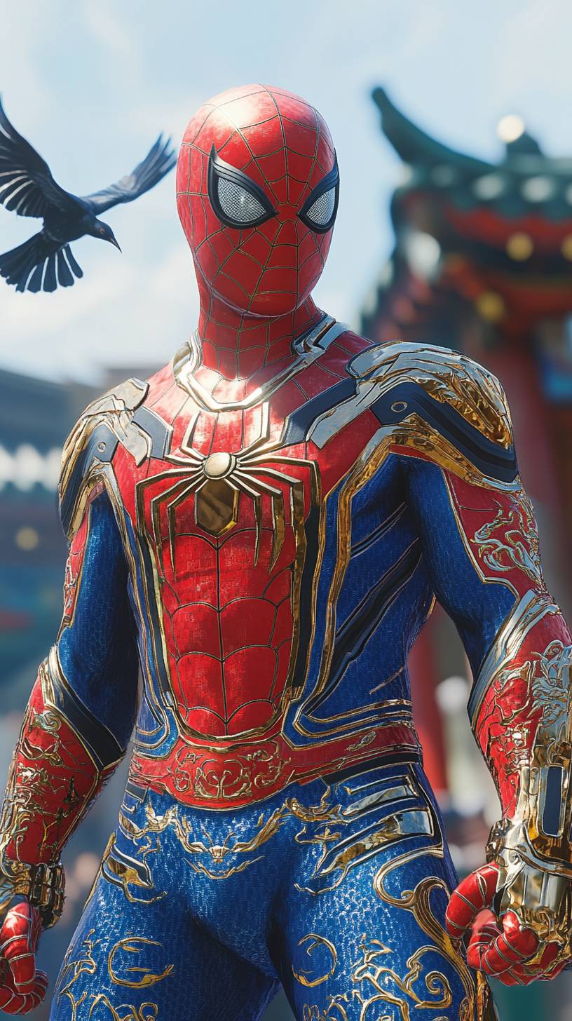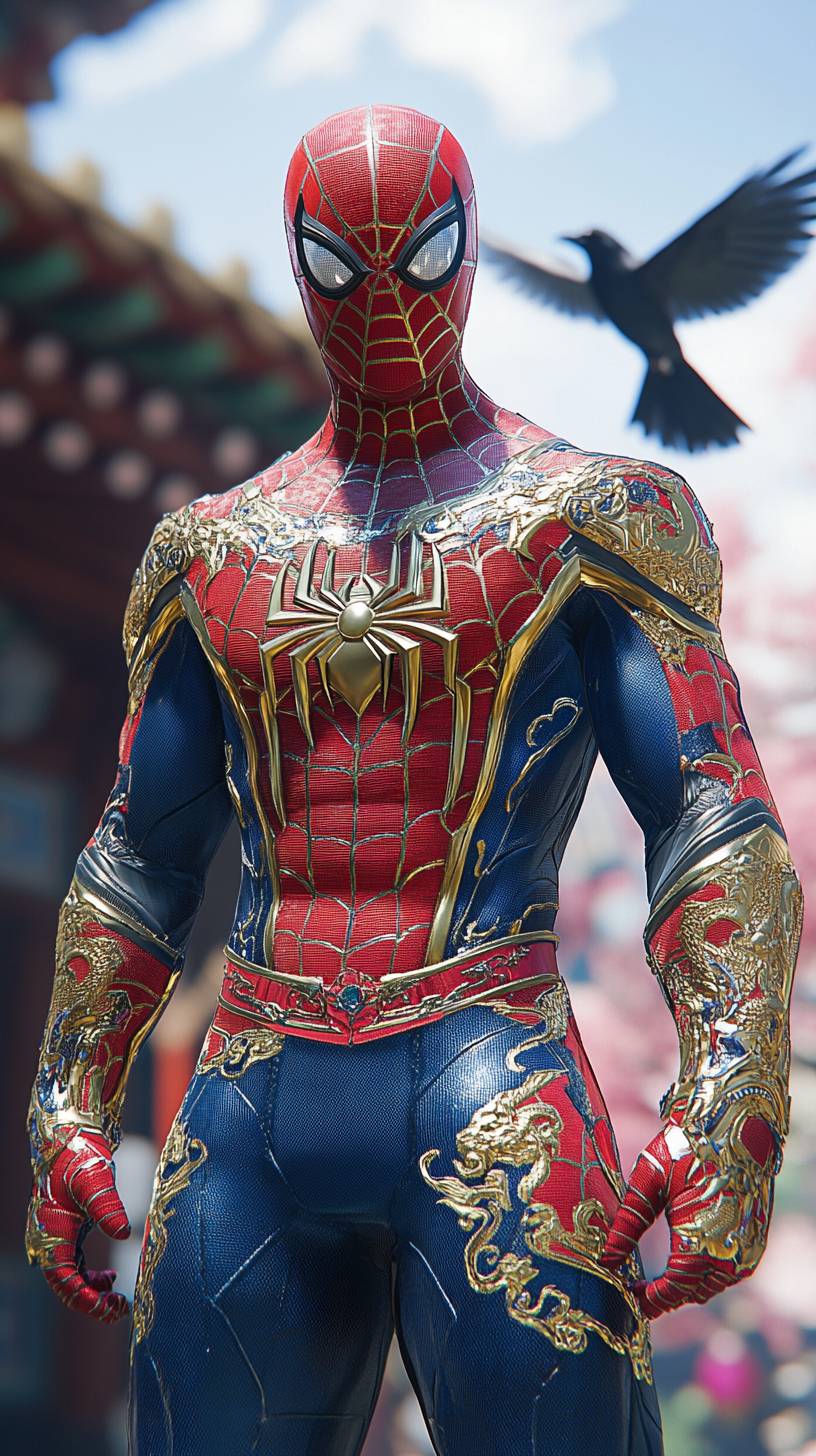 Spider-Man standing in broad daylight in a deep red and blue suit adorned with golden and silver Hanbok patterns, featuring a stylized dragon emblem on his chest. Traditional wave motifs run along the sleeves, and cultural details are woven into his flowing accents. In the blurred background, a majestic magpie soars gracefully in the clear blue sky, adding a subtle yet powerful national touch --ar 9:16 --style raw --stylize 250 --v 6.1