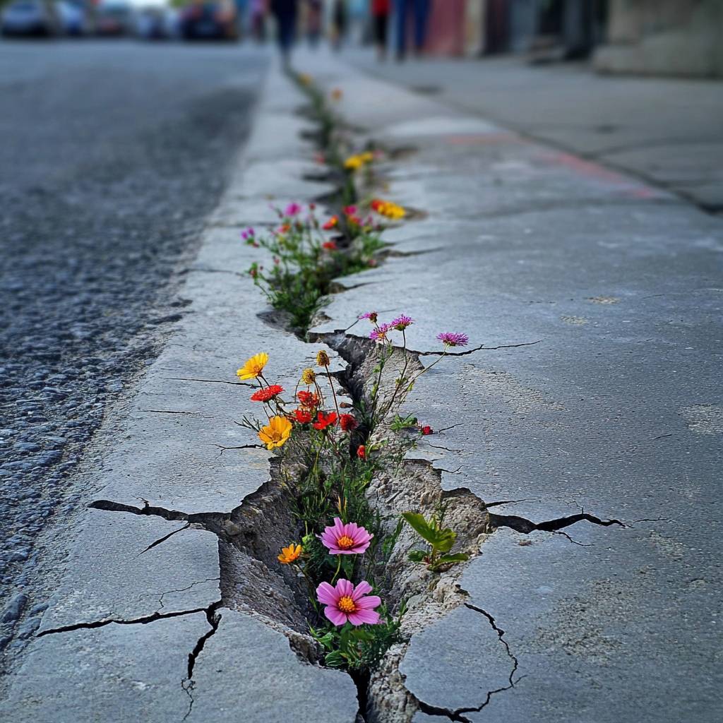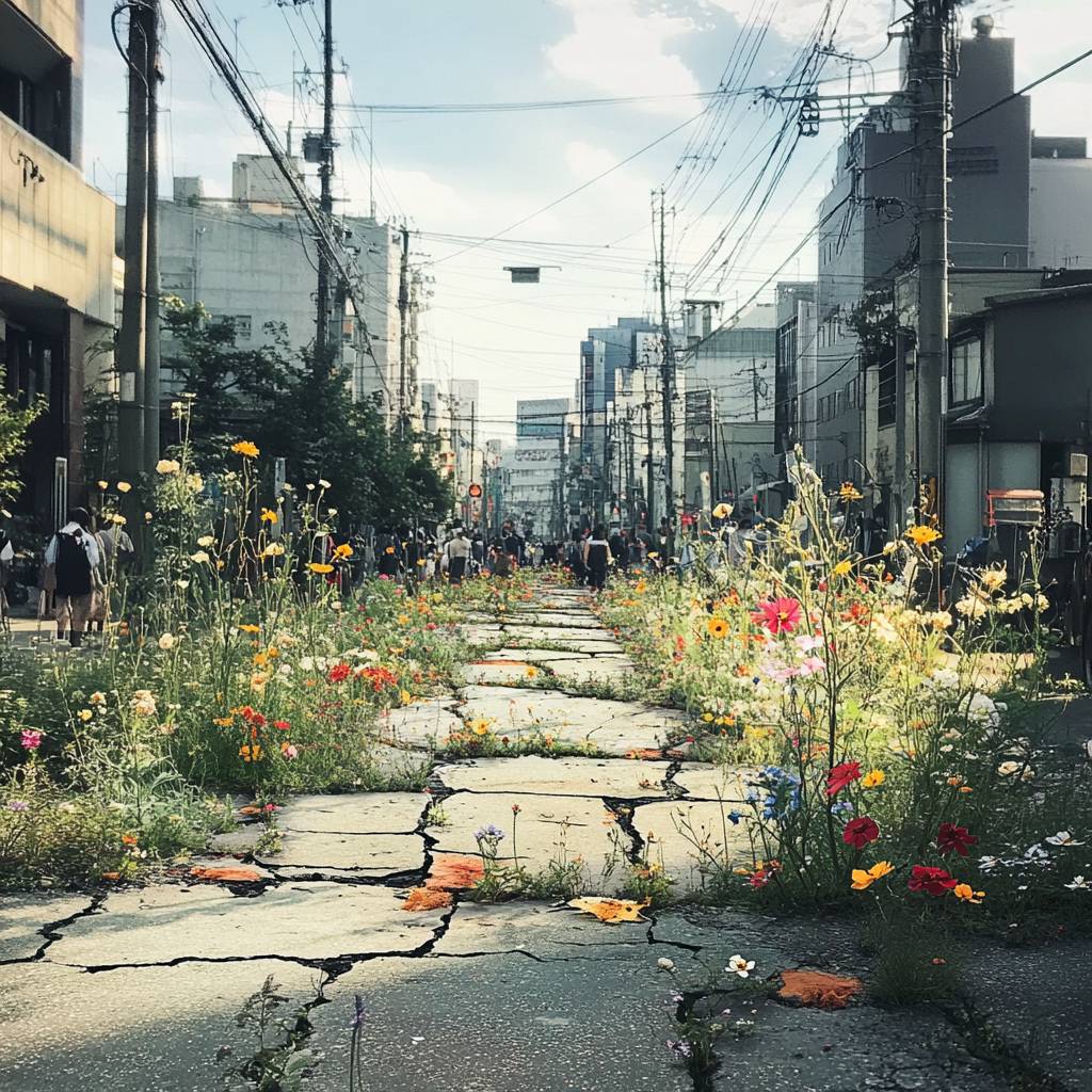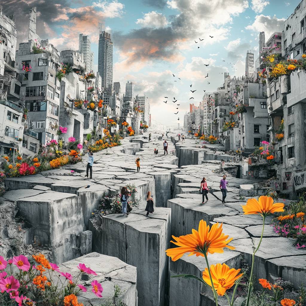 A city’s concrete streets and houses are being reclaimed by nature, with flowers sprouting from cracks, symbolizing hope and harmony with nature.