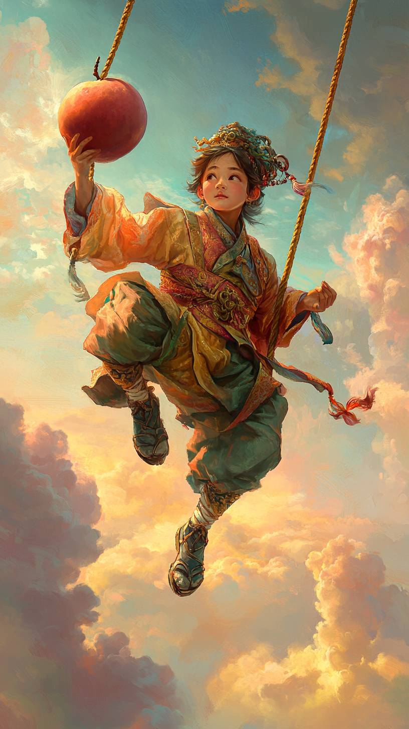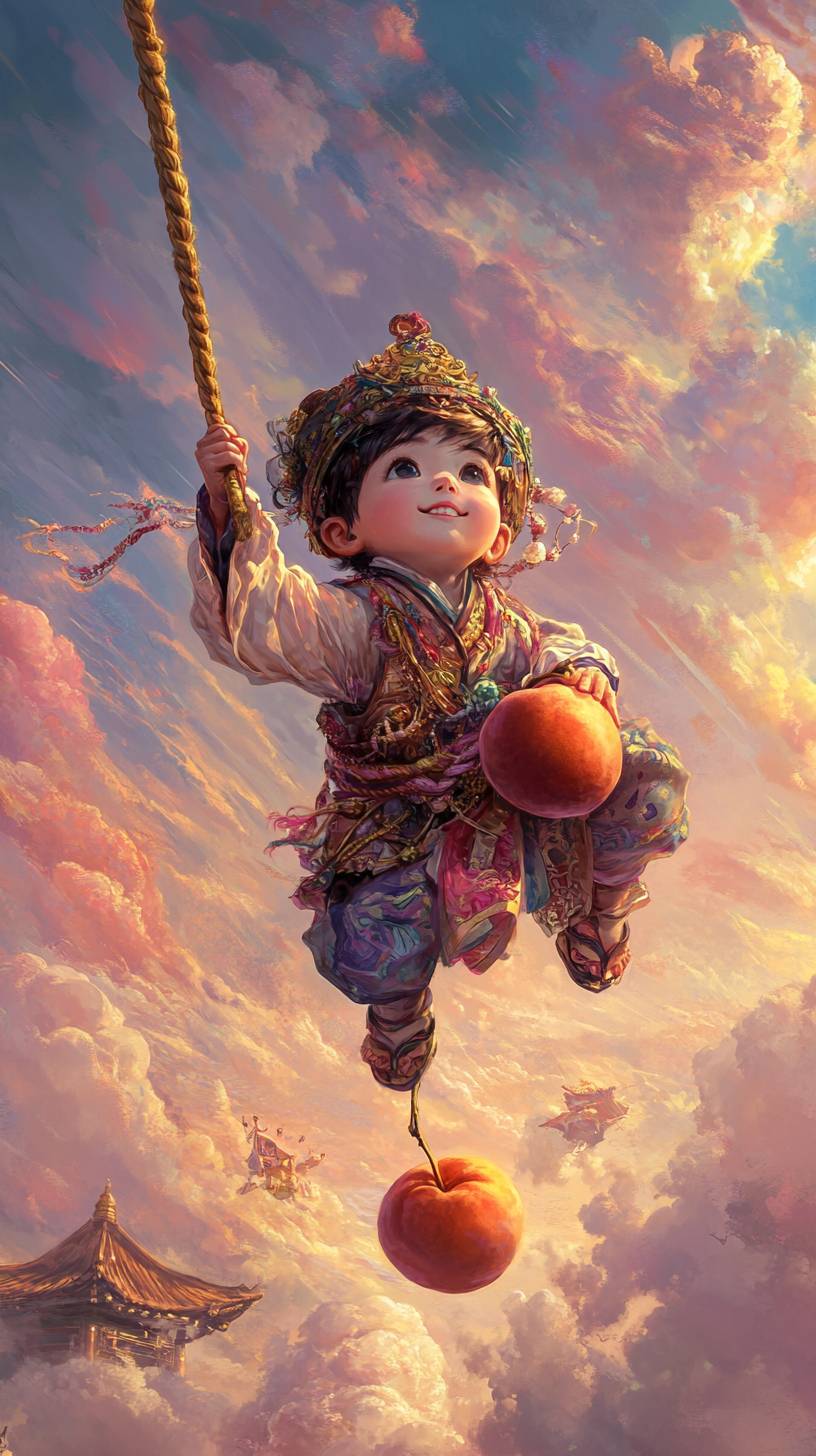A young Chinese boy from ancient times descending from the sky on a rope, holding a large peach in his hand, vibrant colors, whimsical, dynamic pose, playful expression, detailed traditional clothing, ethereal clouds in the background, soft light illuminating the scene, surreal atmosphere, fantasy art style, intricate details, charming composition.