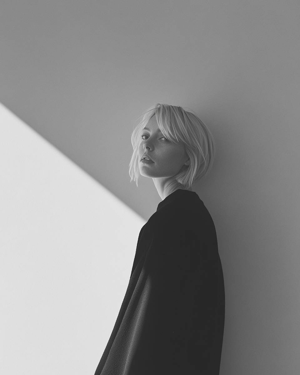 A minimalist black-and-white photograph of a blonde woman in front of a white wall.