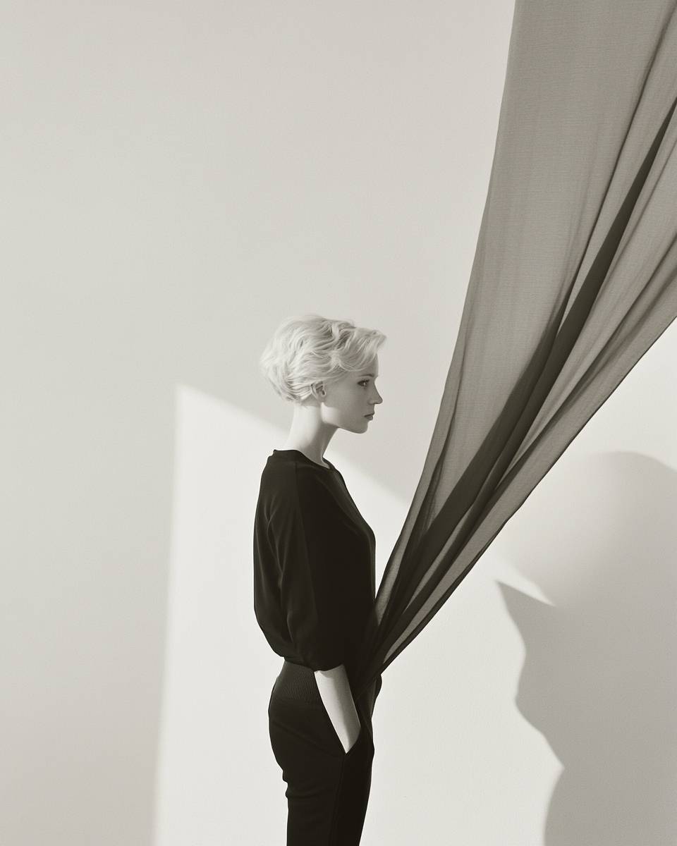 A minimalist black-and-white photograph of a blonde woman standing in front of a white wall. A draped fabric is wrapped around her waist, casting a shadow on the wall behind her. The photograph is a profile view, with the woman looking over her shoulder at the camera. It is a full-body shot, exemplifying minimalist photography.