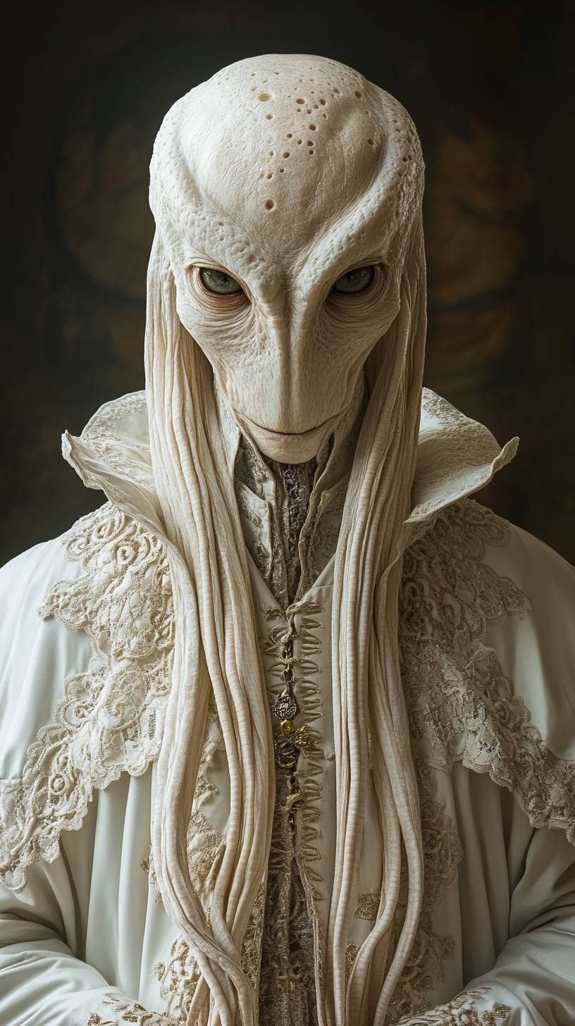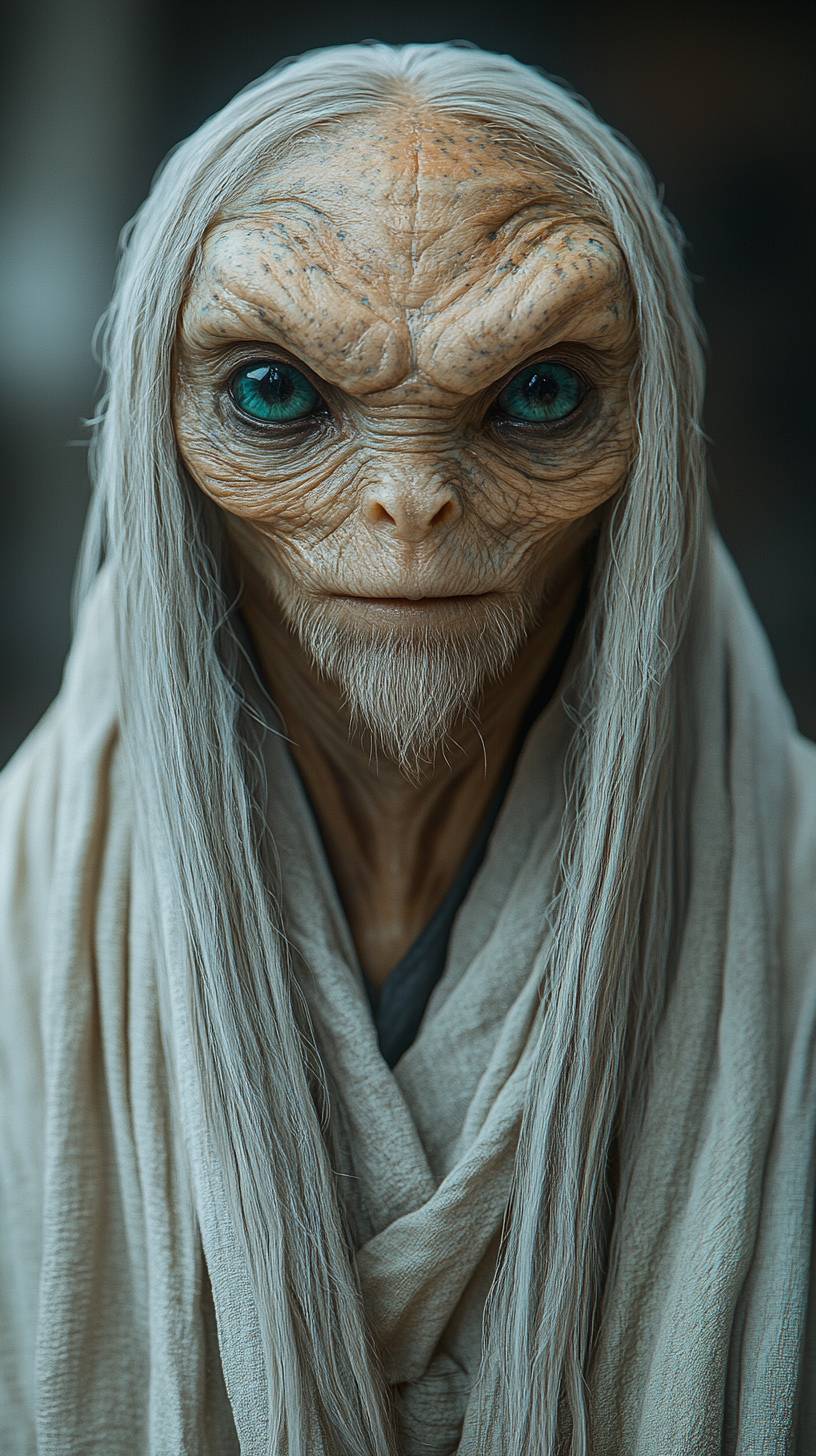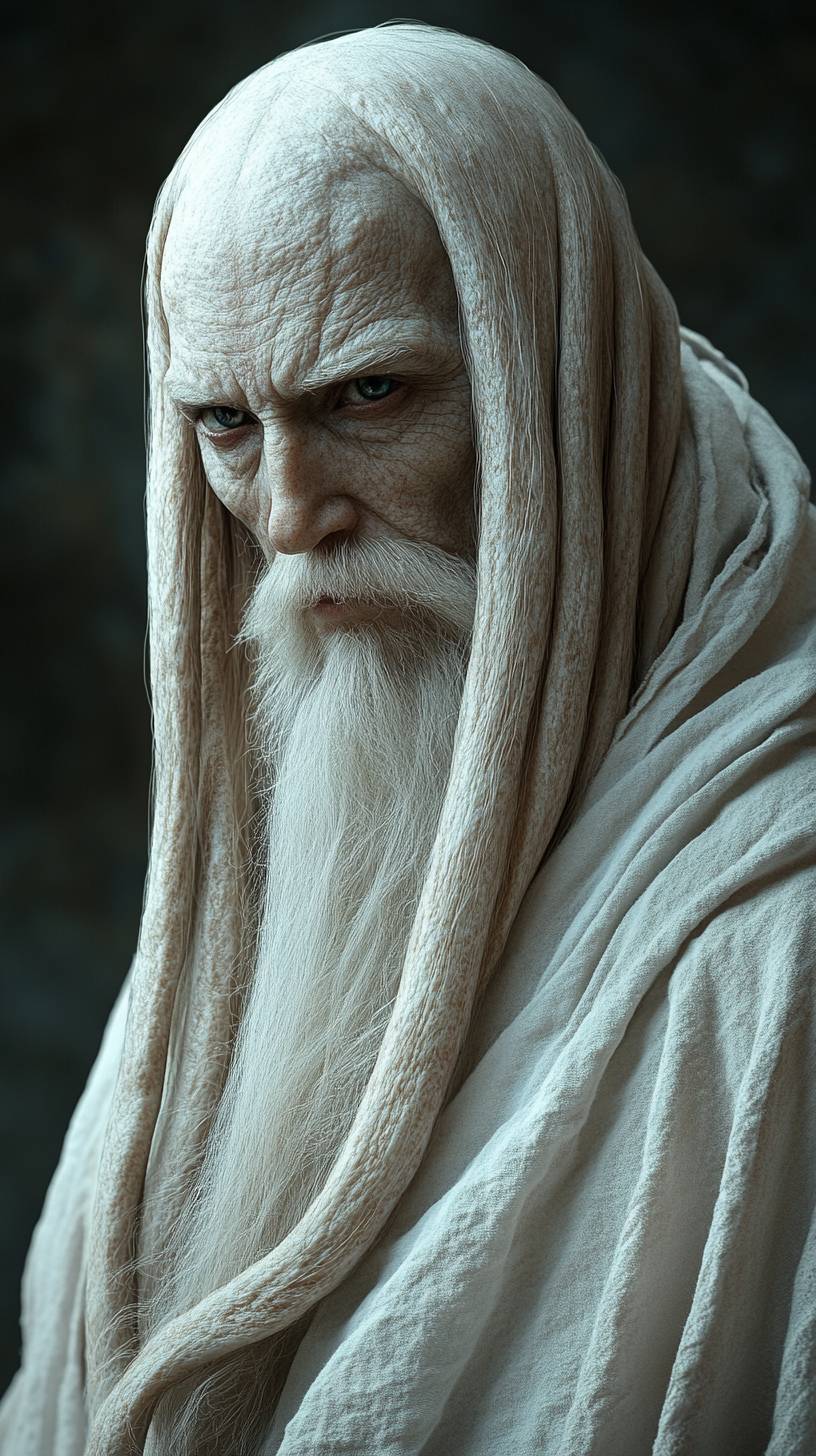 An old alien wizard with black beard, long hair, golden eyes, wearing white robes.