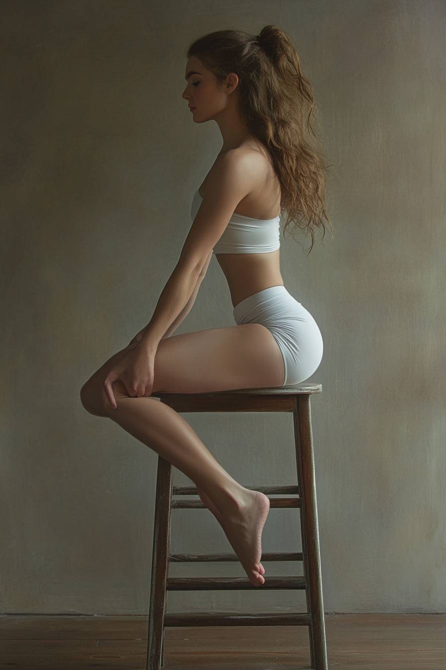 A young woman in tight-fitting yoga clothes is striking a graceful and dynamic pose on a simple dining chair, expressing joy and playfulness.
