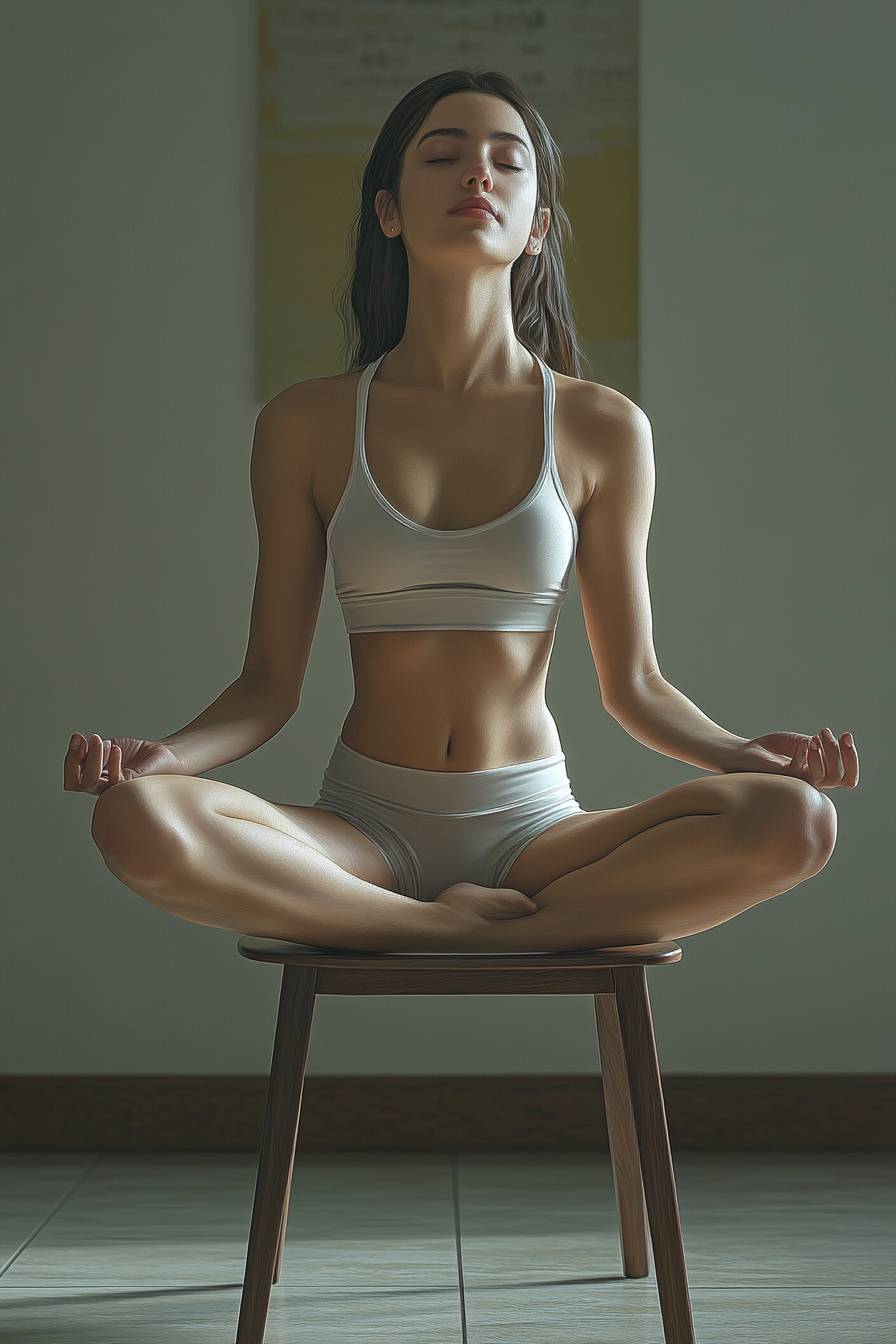 A young woman in tight yoga clothes strikes a graceful and dynamic pose on a simple dining chair, expressing joy and playfulness.