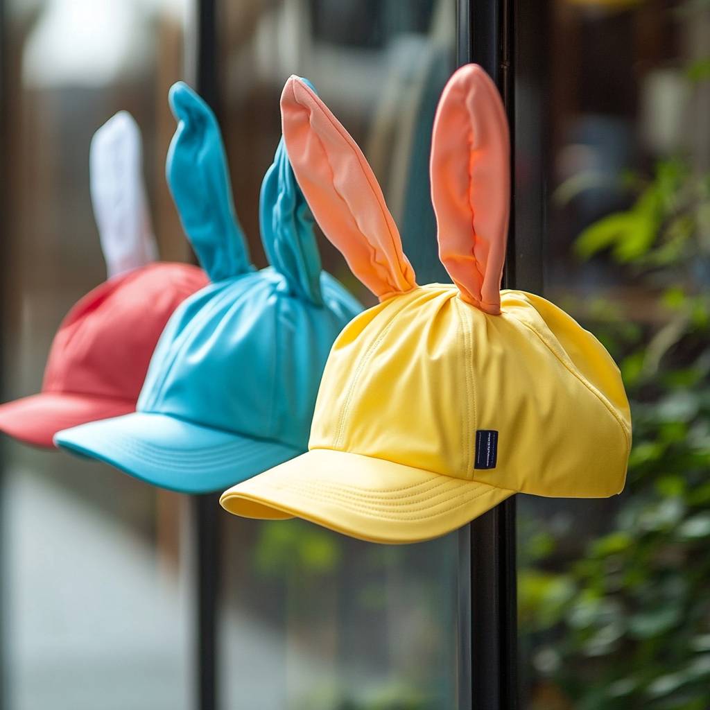 Casual, brightly colored duck-tipped hats hang loosely with cozy and cute bunny ears paired with breathable fabrics for outdoor activities. Whether you're running, walking, or lounging, rabbit ears are soft and flexible, wiggling gently as you move. On the side of the hat there are sports stripes or small logos that emphasize its active and laid-back nature. --v 6.1