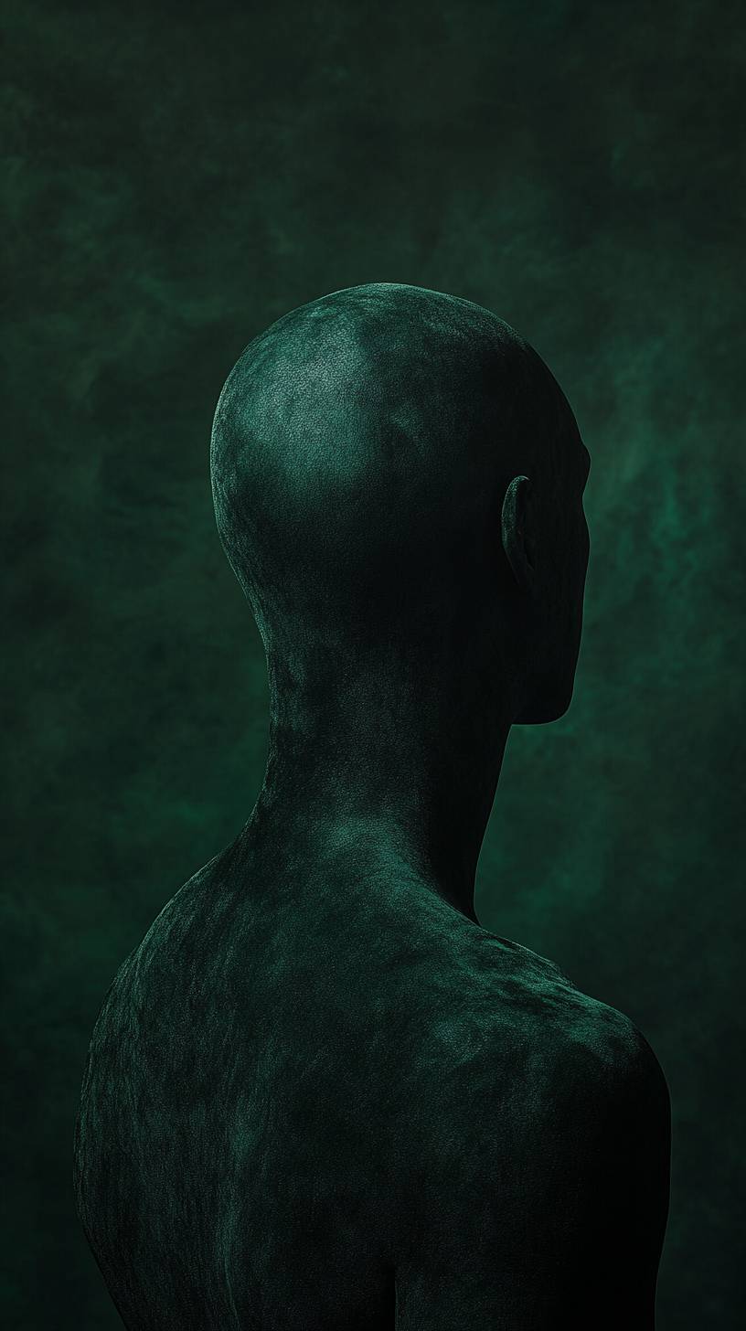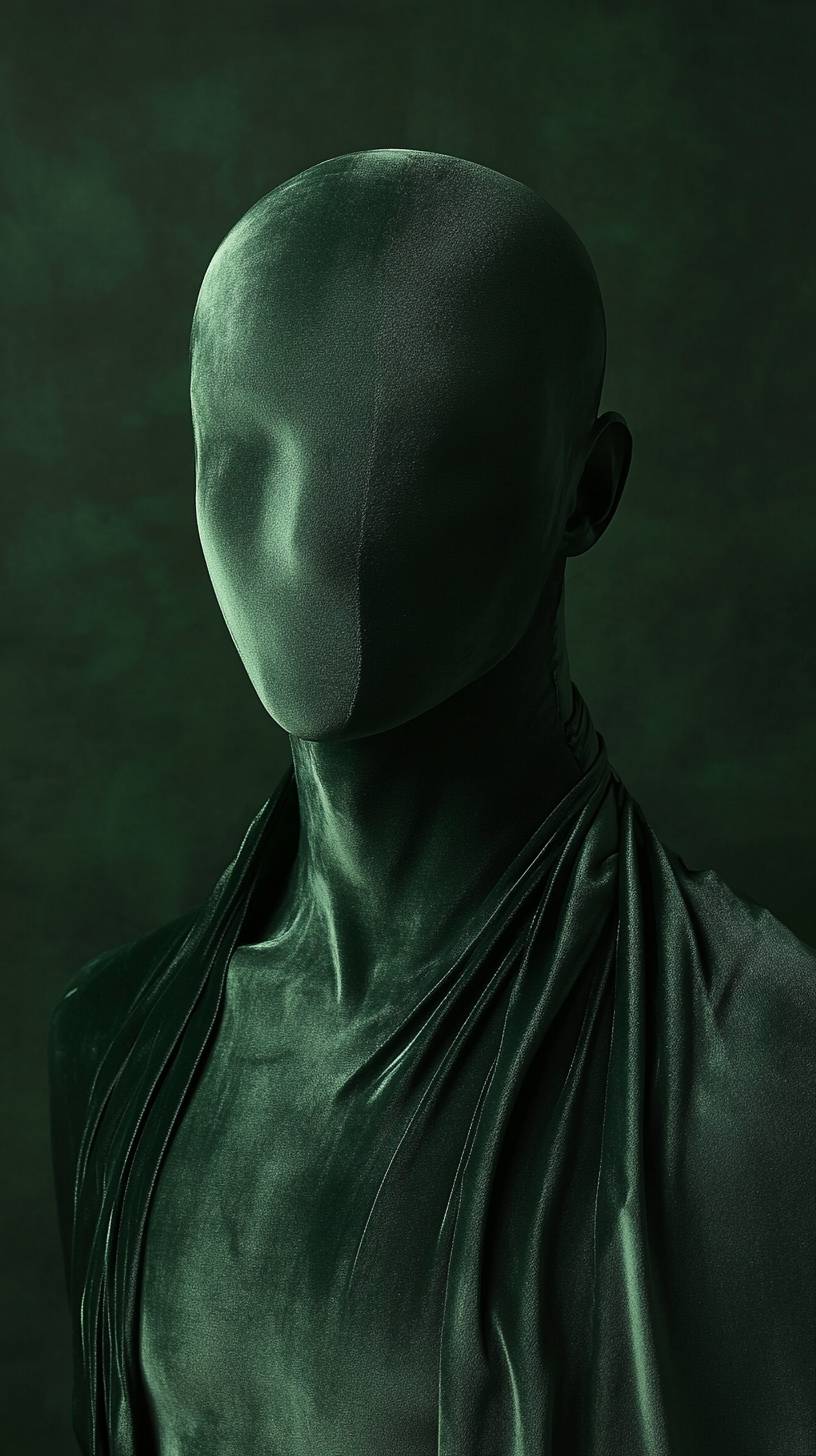 hyper realistic, portrait of dark green velvet simplified head and torso, matte dark green studio, photoshoot --ar 9:16 --style raw --v 6.1