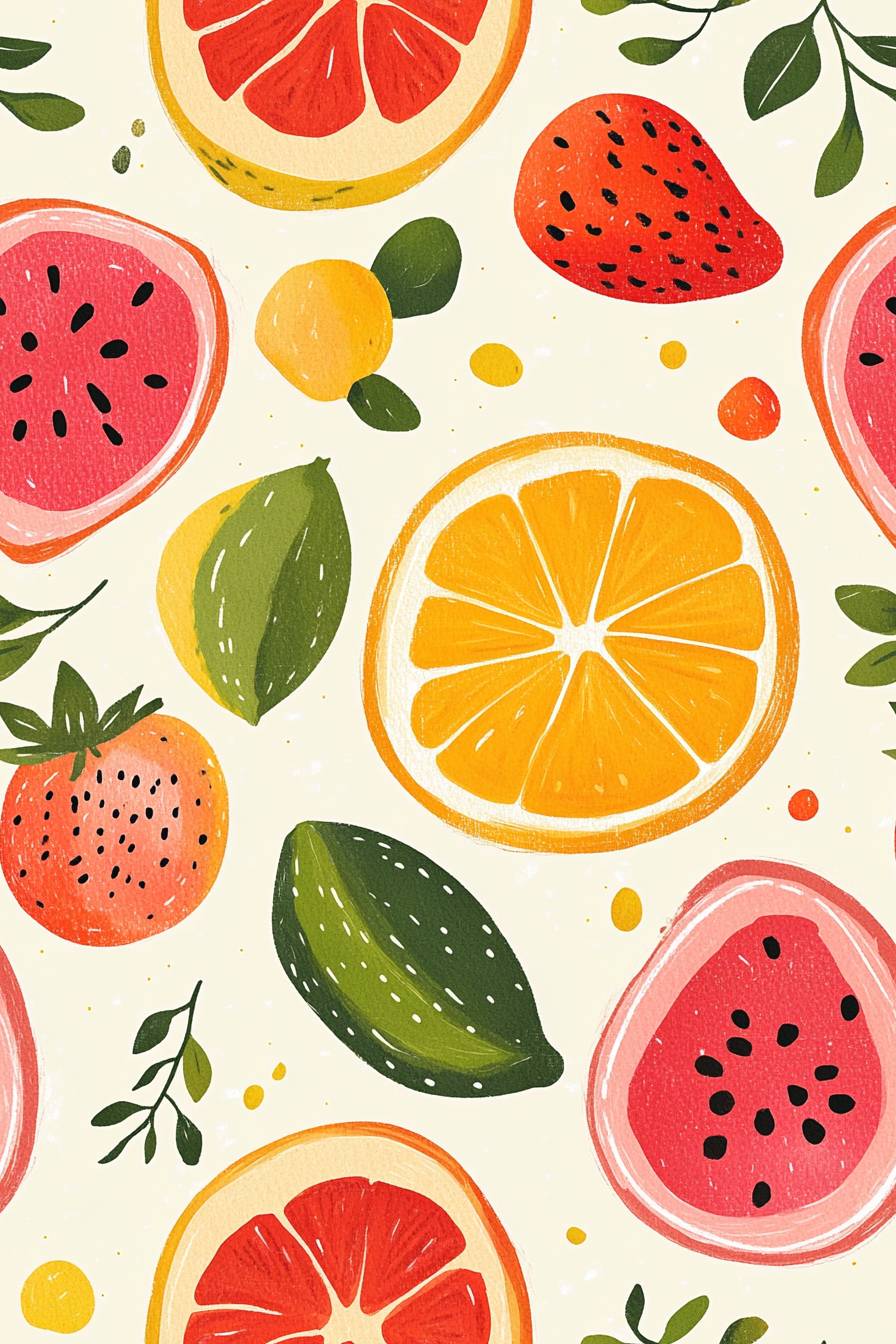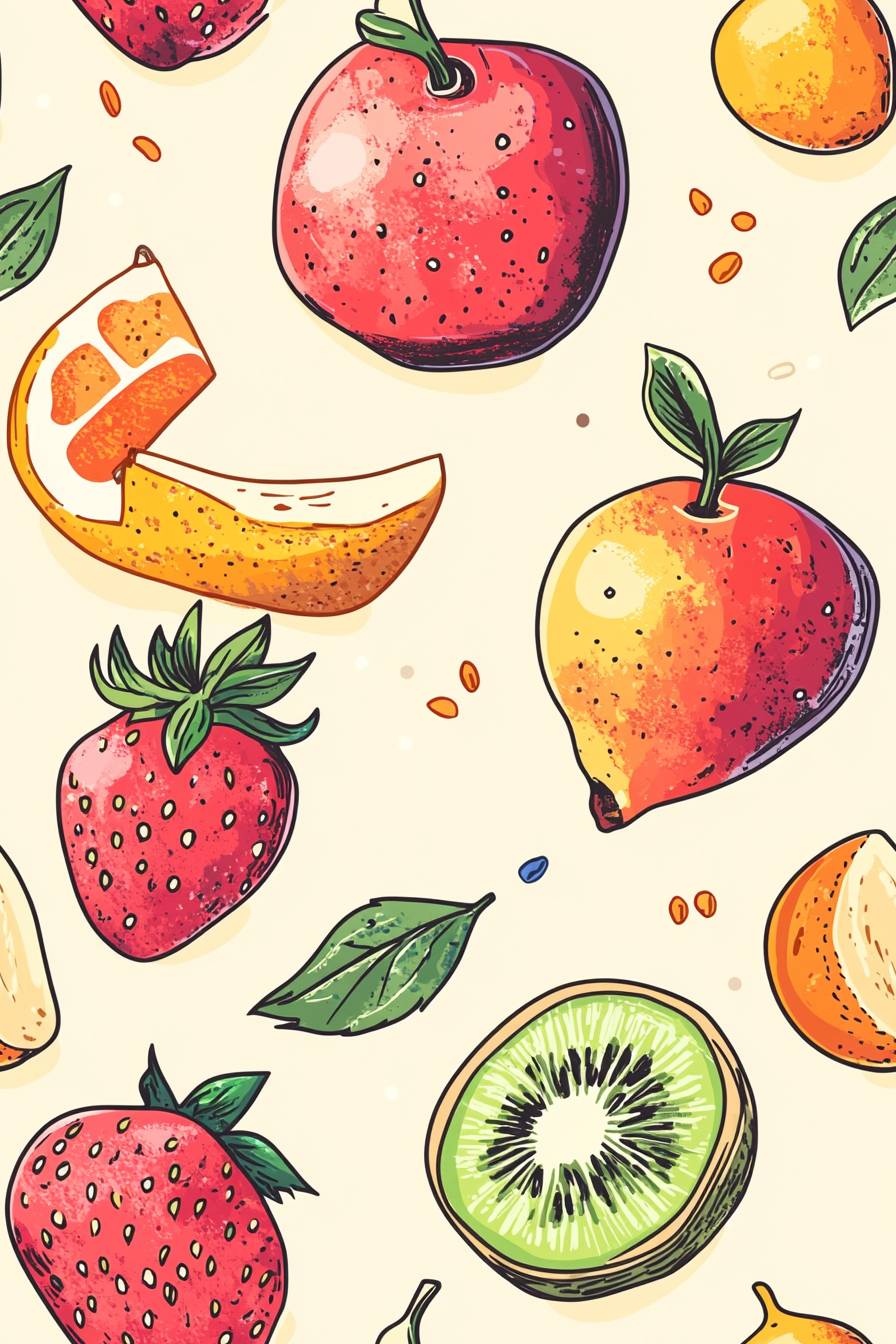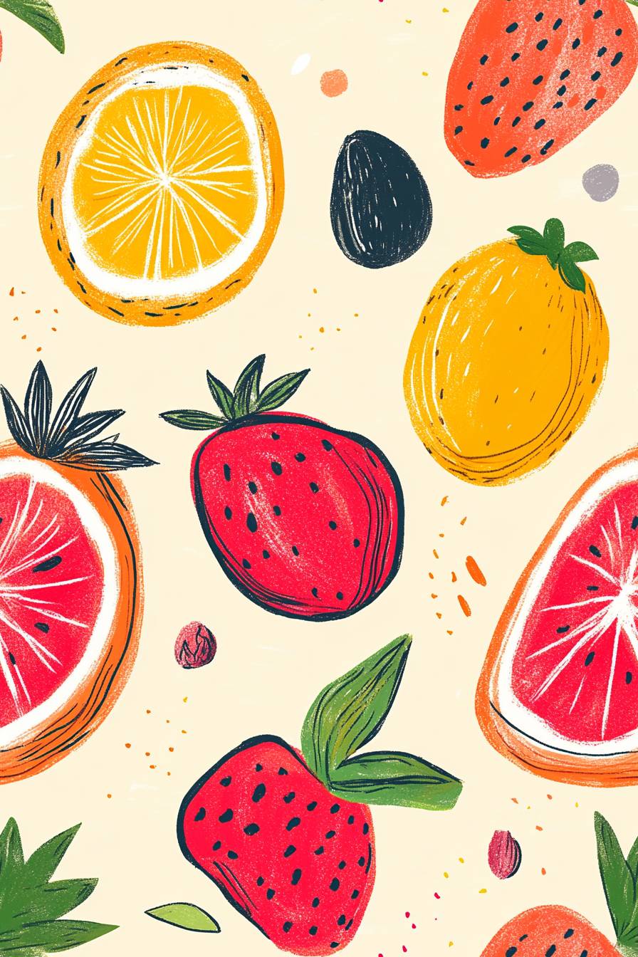 Fruit drawing print with a variety of bright and cheerful colors: pinks, reds, oranges, yellows and greens. Simple strokes with discreet outlines. Light yellow background. --ar 2:3 --tile --stylize 250 --v 6.1