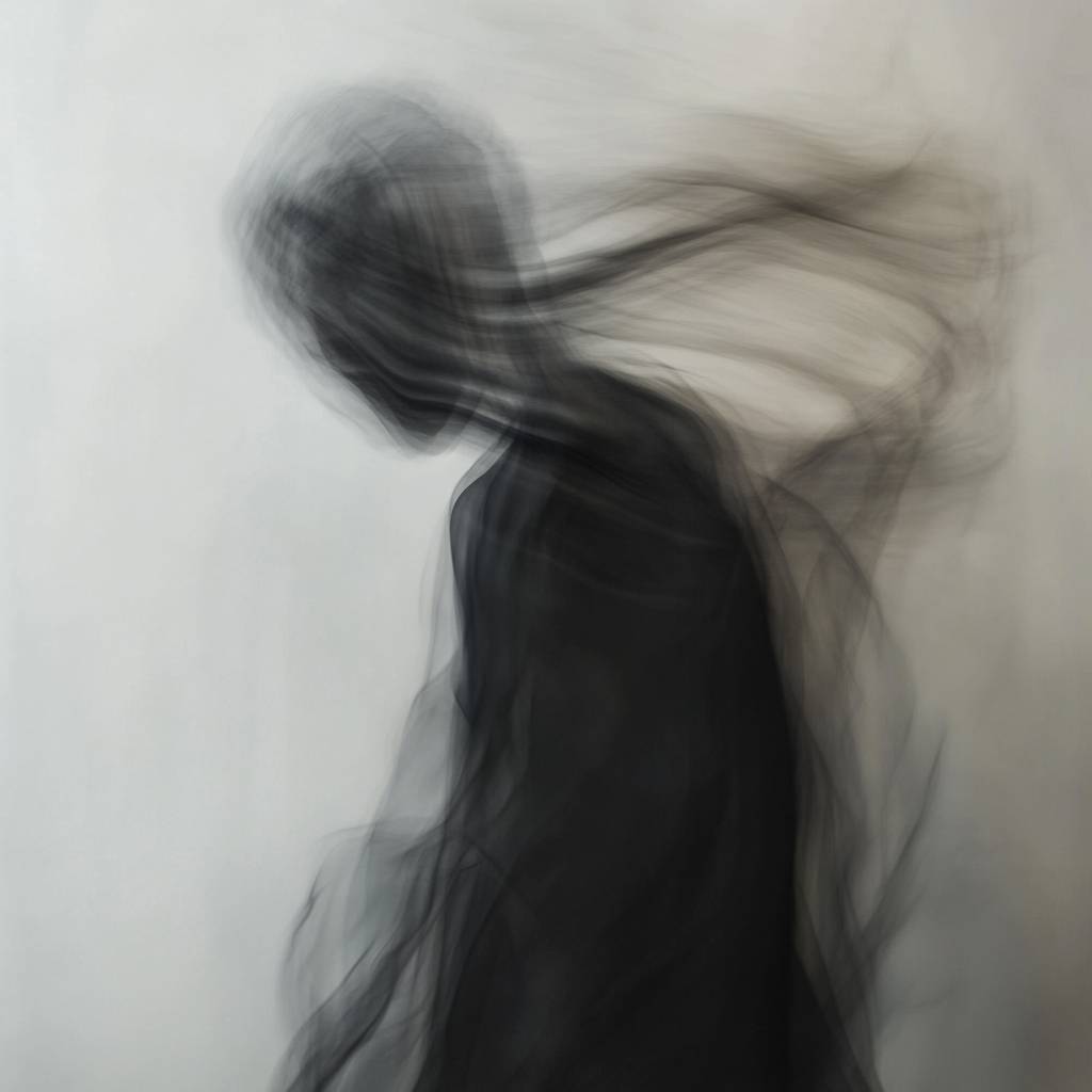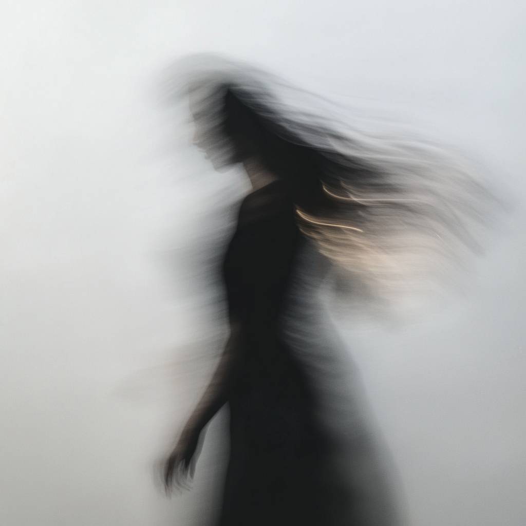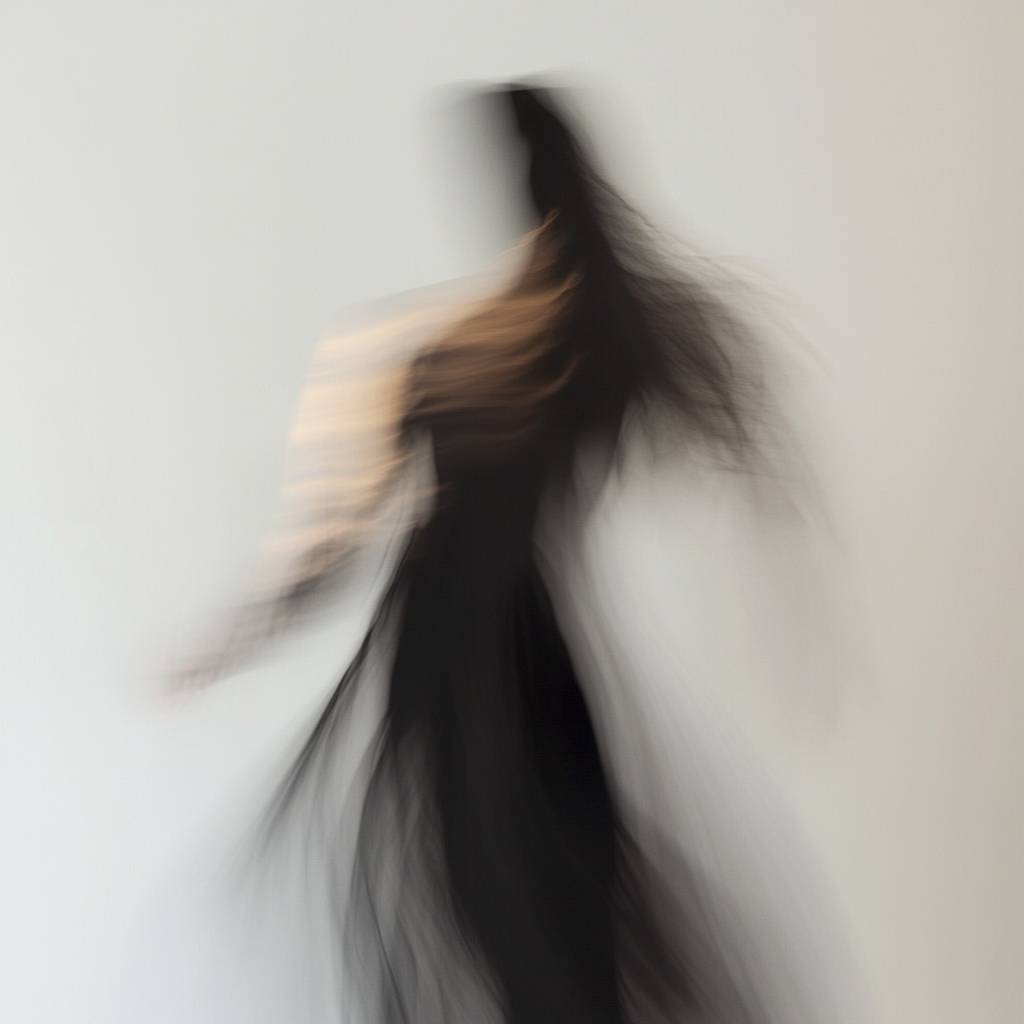 A dreamy, dark-coloured, abstract fashion editorial photograph of a person in motion, creating a ghostly, blurred effect with soft focus. The background is light and minimal, giving an eerie and ethereal feel. The figure's form is indistinct, blending into shades of black, greys, and subtle warm tones, as if fading into the background. The movement creates a sense of fluidity, with a modern, minimalist atmosphere. The image feels like a super high-quality editorial photo, eerie, surreal, and atmospheric, reminiscent of a memory or an apparition.