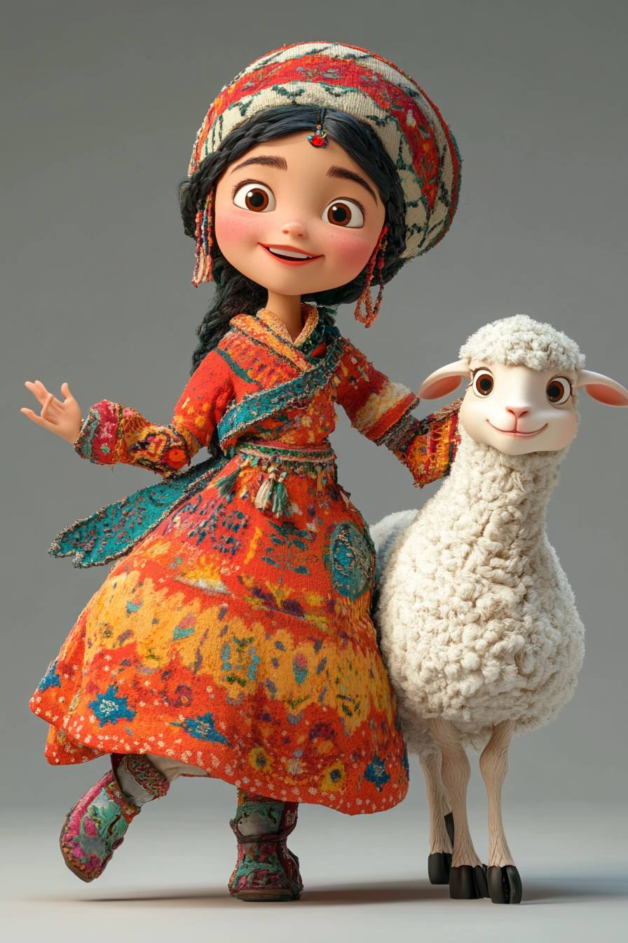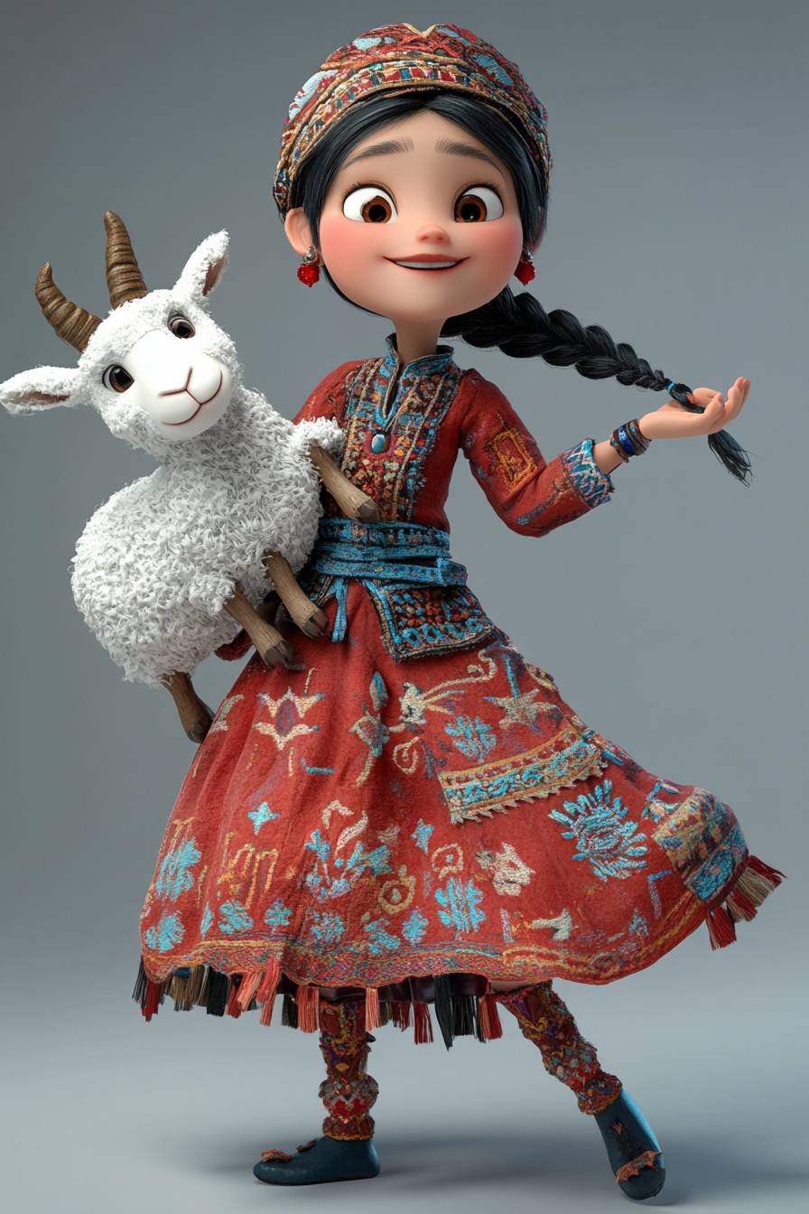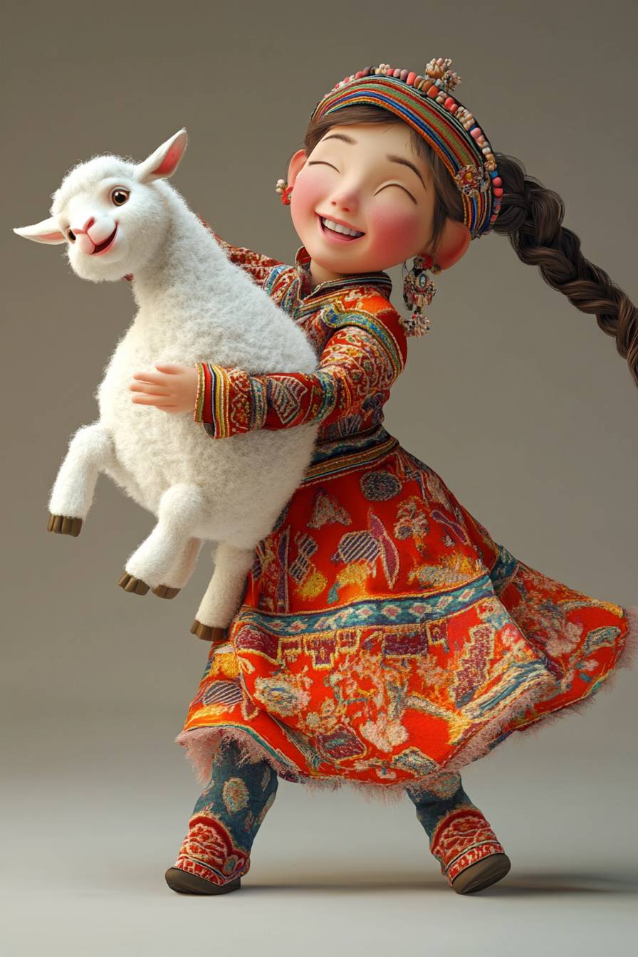 Buryat girl in Buryat national costume dancing with a lamb, 3D, Pixar style.