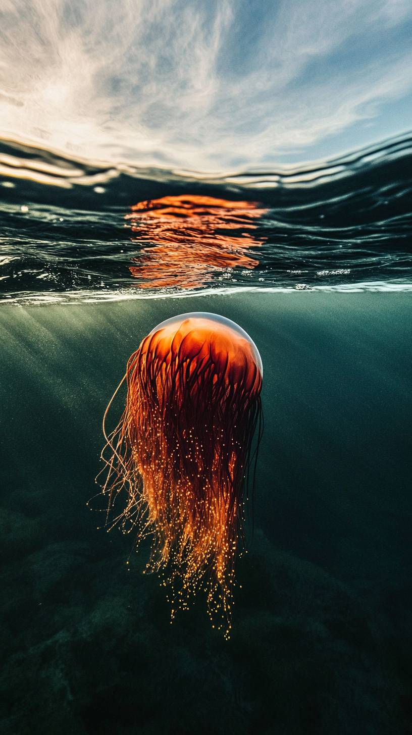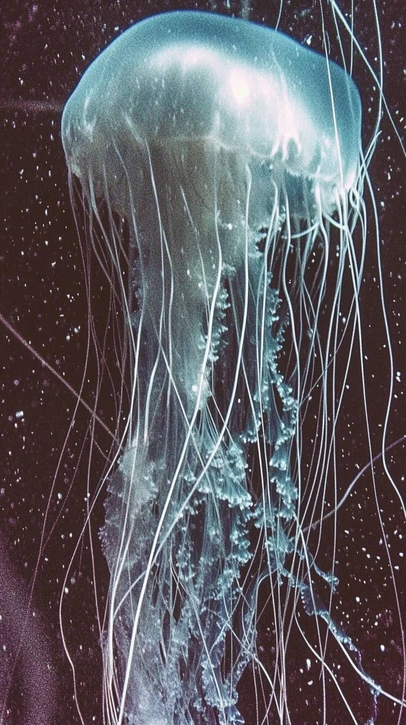 An ‘Immortal Jellyfish’ gently pulsing with bioluminescent light, suspended in open water. Its translucent body shows the start of its cellular reversion, and the water around it is filled with tiny, glowing particles that highlight its mystique. --ar 9:16 --style raw --sref 2708115204 --sw 70 --stylize 250 --weird 30 --v 6.1