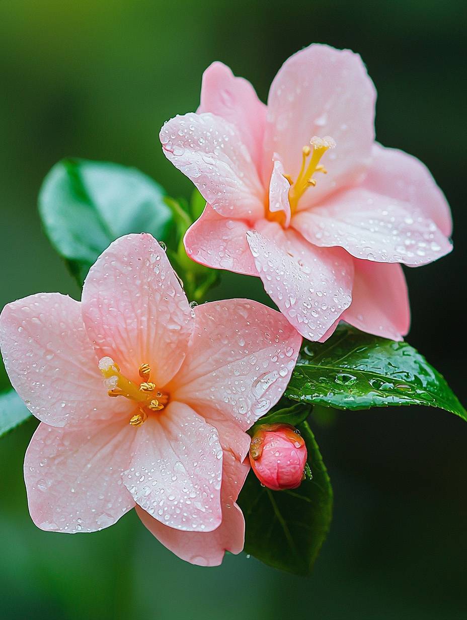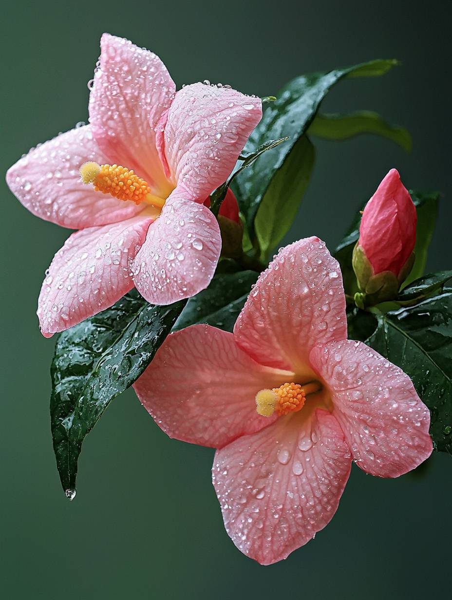 Pink flowers with pink petals and yellow stamens grow on green leaves with water droplets, captured through macro photography in high definition. The vibrant, beautiful colors and delicate details are showcased in these real, high-resolution photos. Two blooming Chinese gardenias, with two small red buds in the middle of each flower, stand against a green background, bathed in natural light. A pair of blossomed Chinese gardenia flowers, their pink petals free of dewdrops. --ar 3:4 --quality 2 --v 6.1