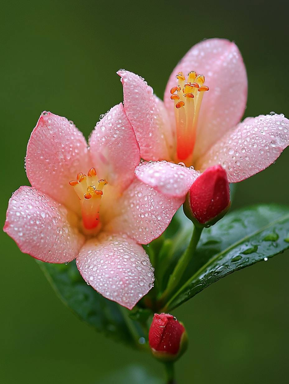 Pink flowers with pink petals and yellow stamens grow on green leaves with water droplets, captured through macro photography in high definition. The vibrant, beautiful colors and delicate details are showcased in these real, high-resolution photos. Two blooming Chinese gardenias, with two small red buds in the middle of each flower, stand against a green background, bathed in natural light. A pair of blossomed Chinese gardenia flowers, their pink petals free of dewdrops.