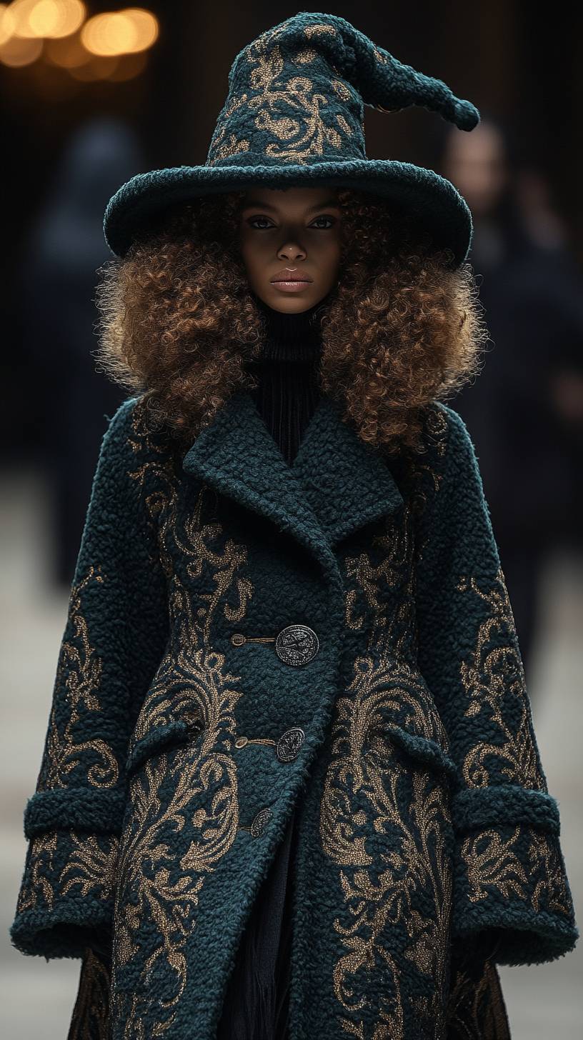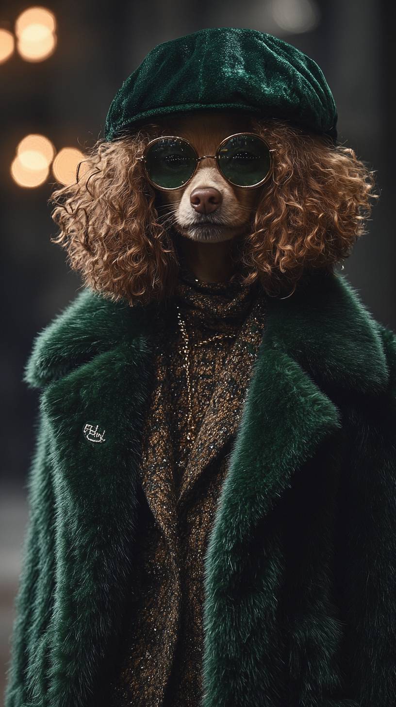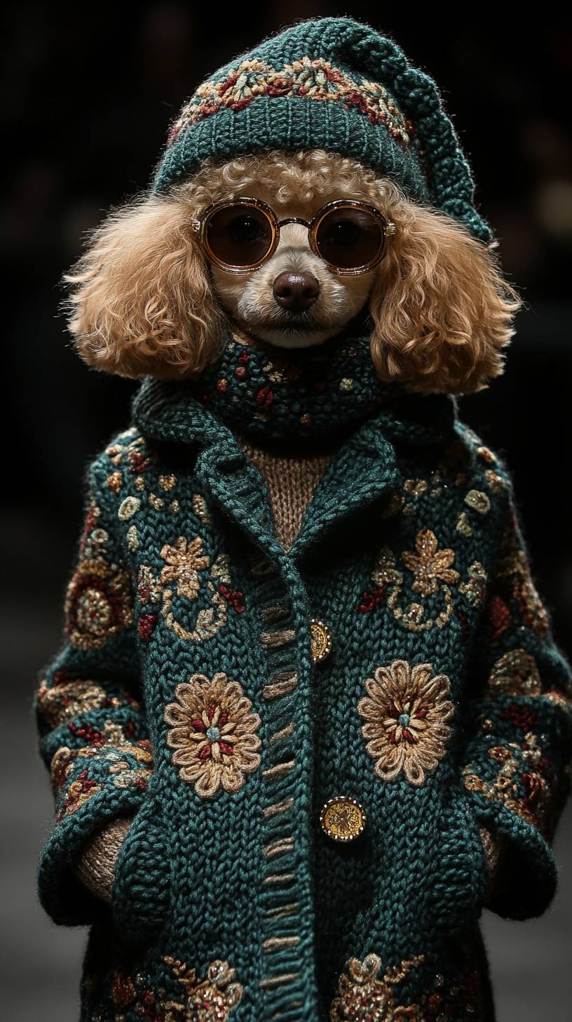 style by maison margiela,Toy Poodle, Christmas-themed Harry Potter-inspired fashion runway, slowly walking, shoes::1.5 , on the model runway, Milan fashion show, long shot, dynamic capture of runway shows, front view, motion capture runway show, full body, facing the camera. The Poodle is dressed in a stylish Slytherin-inspired outfit with a shimmering green and silver cloak, embroidered with snowflakes, holly, and enchanted mistletoe. The Poodle also wears a velvet wizard hat with silver bells and red berries. The background includes sparkling holiday lights, floating Christmas decorations, and a snowy enchanted backdrop.::1 --ar 9:16 --stylize 750 --v 6.1