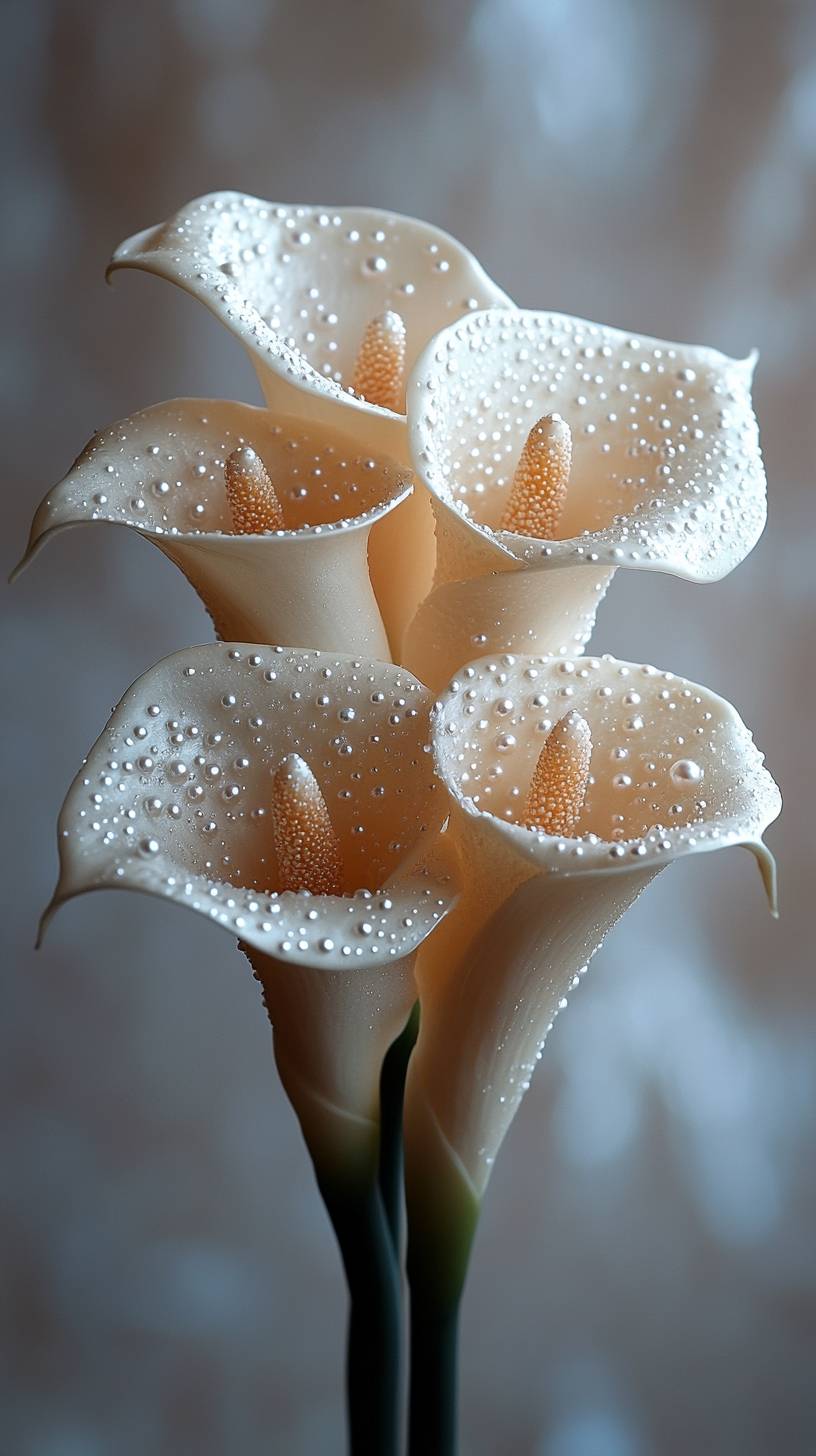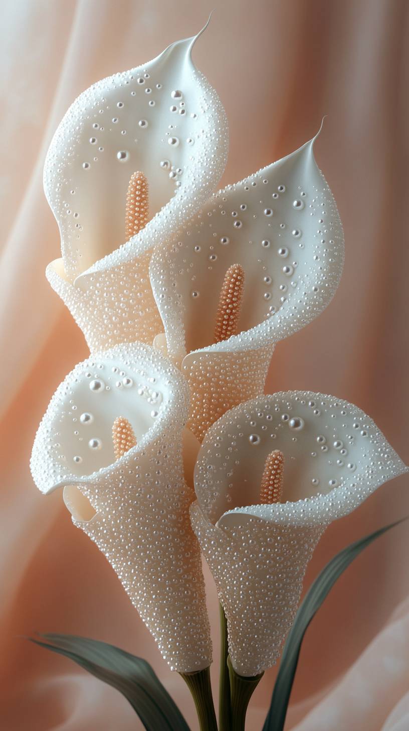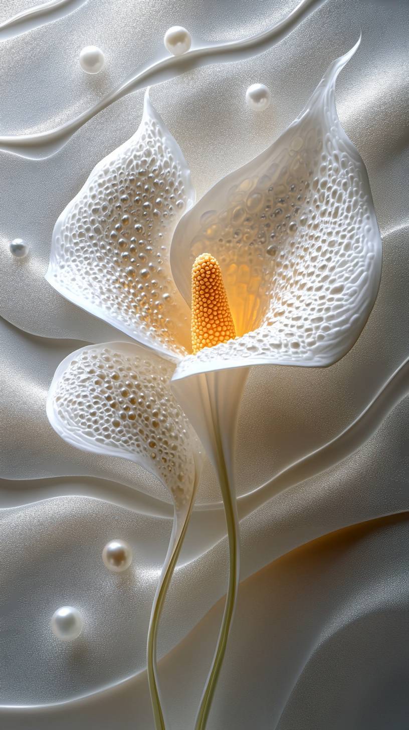 A simple yet elegant white calla lilies flower made of scattered pearls, symbolizing the graceful beauty of natural pearl formation in an oceanic setting. Luxury and elegance through its clean lines and soft lighting, creating a visually stunning representation of nature's enchanting gemstones. --ar 9:16 --stylize 500 --v 6.1