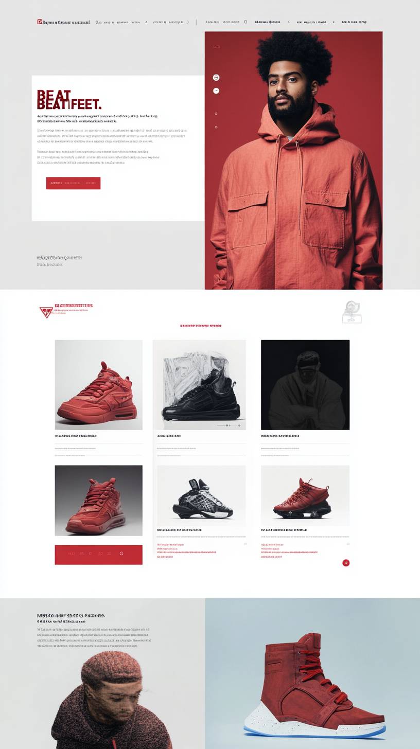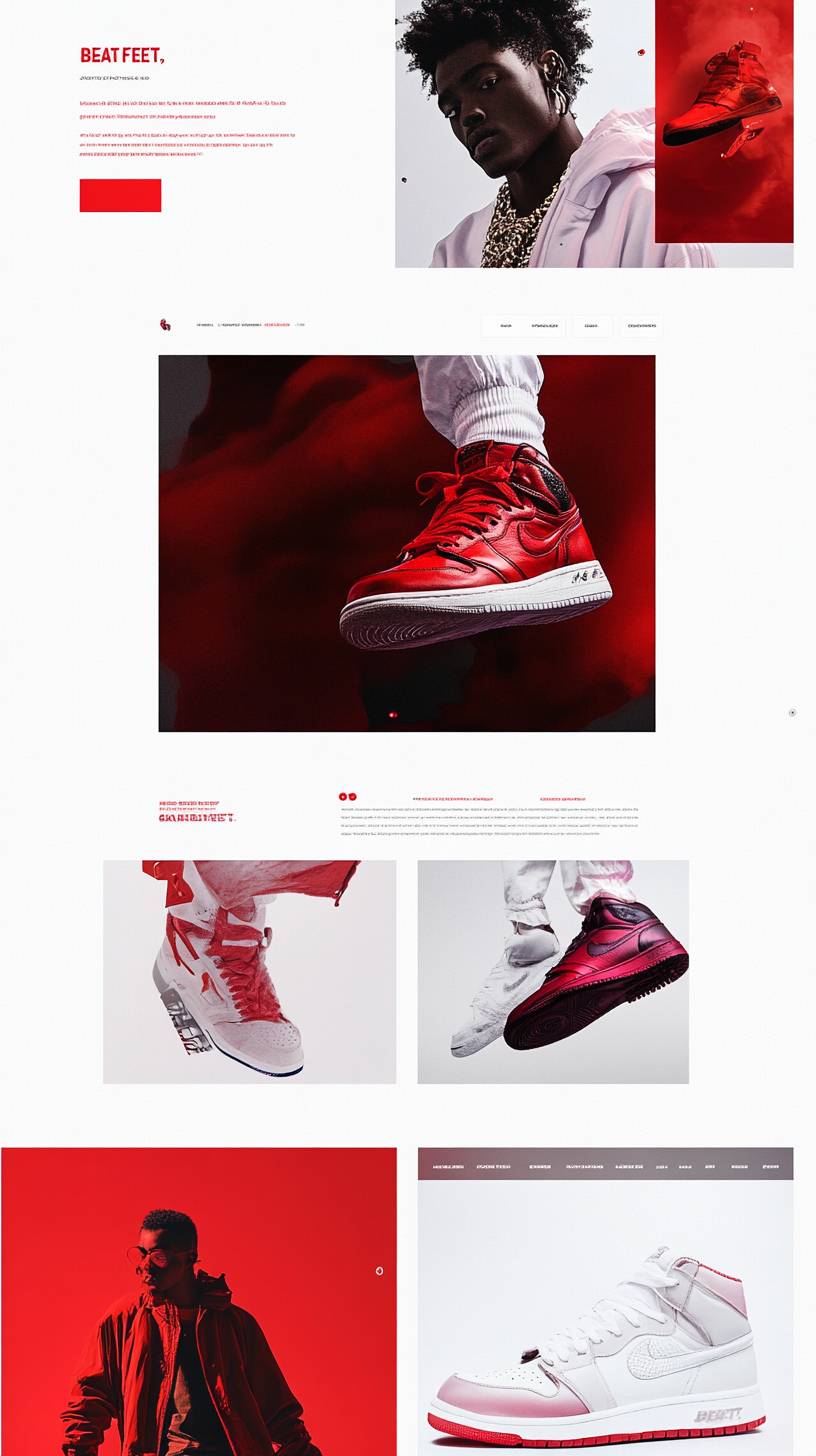 A landing page for "BEATFEET," featuring a white background, a modern UI/UX style, and a minimalistic design with a hero section and photos in a red color palette. The website has three sections showcasing their art being used in the style of fashion designers, sports brands, and music. It's about showcasing digital artwork on and shoes. --ar 9:16 --video --v 6.1