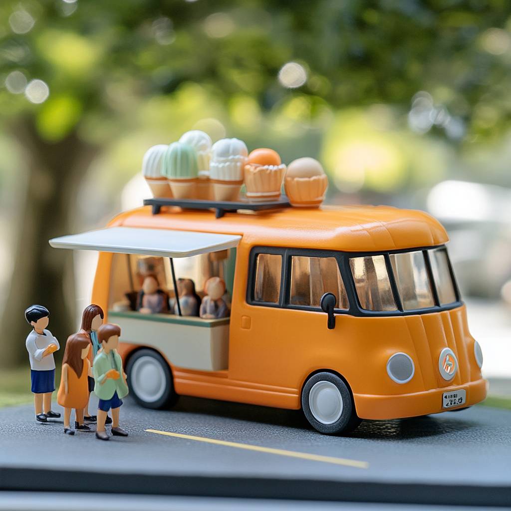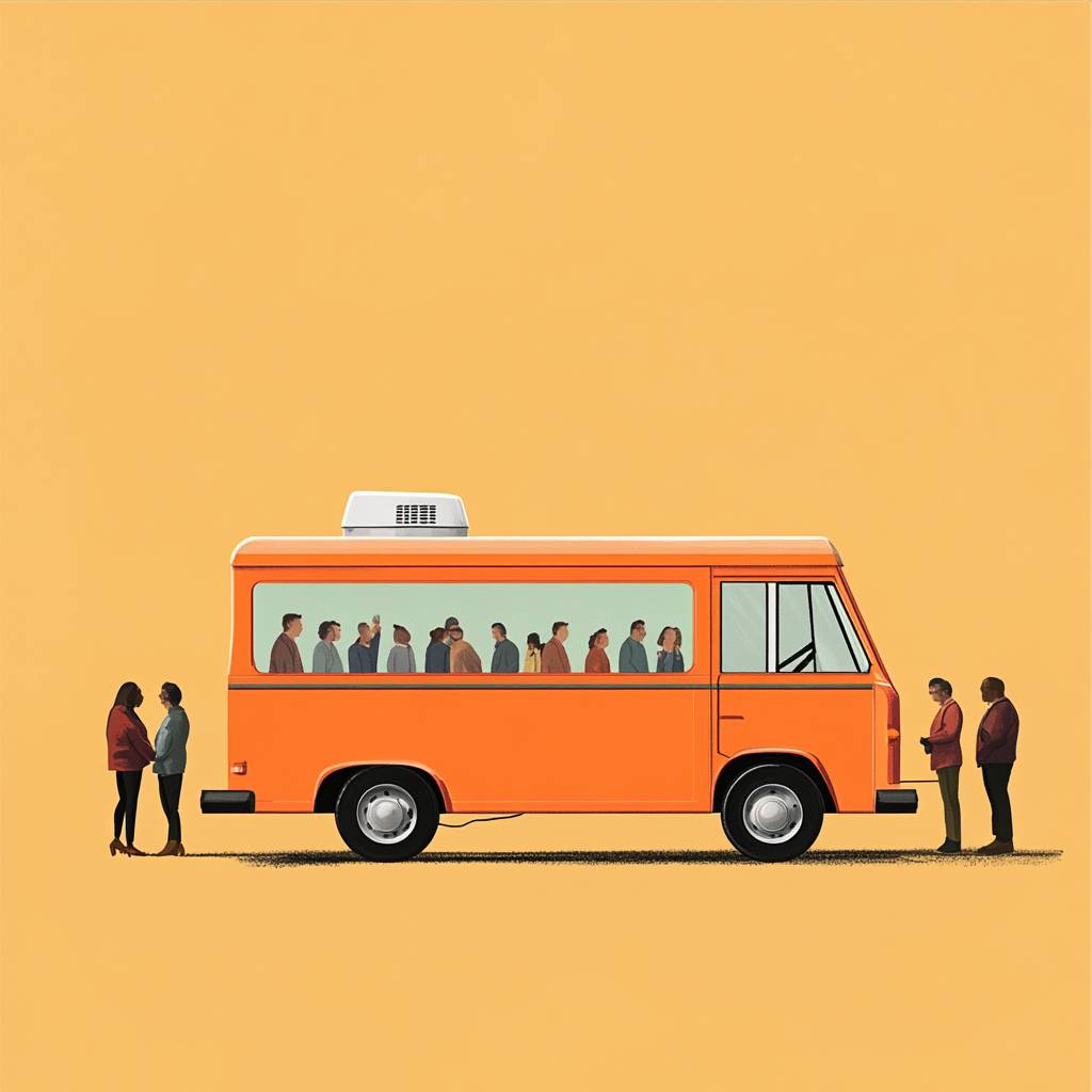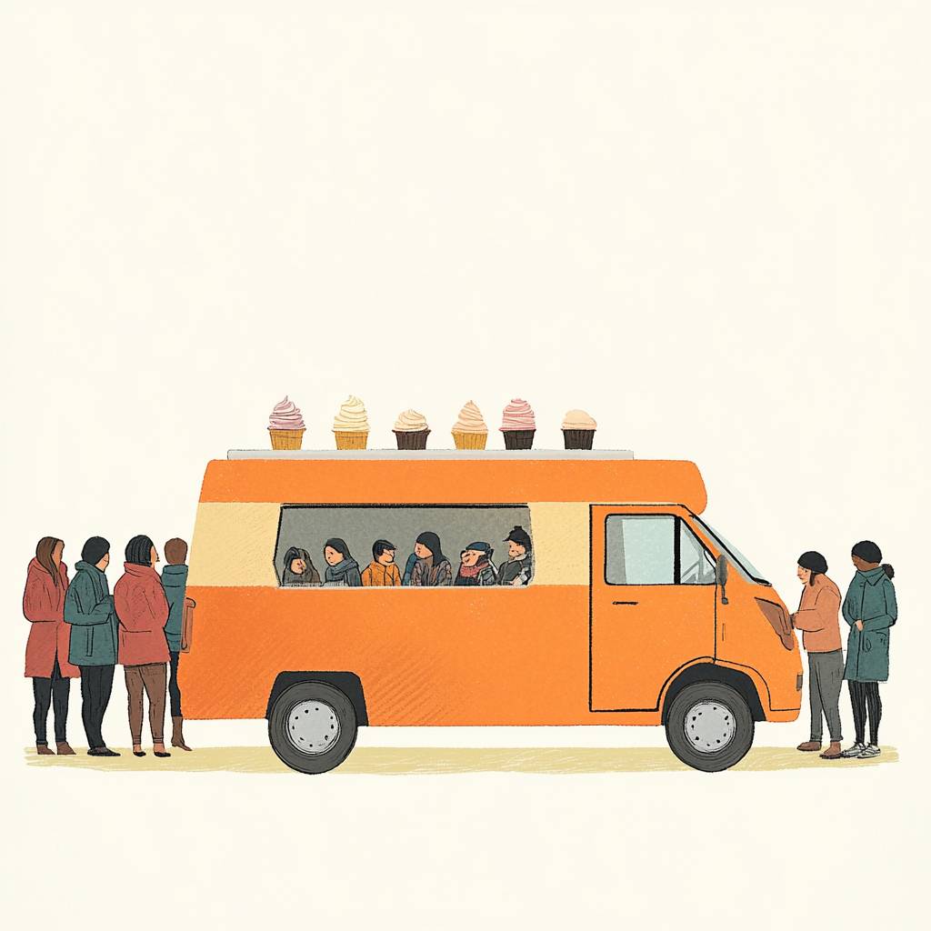 An orange EV ice cream van with a long queue of people.