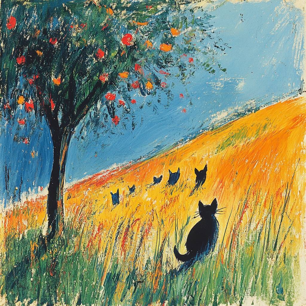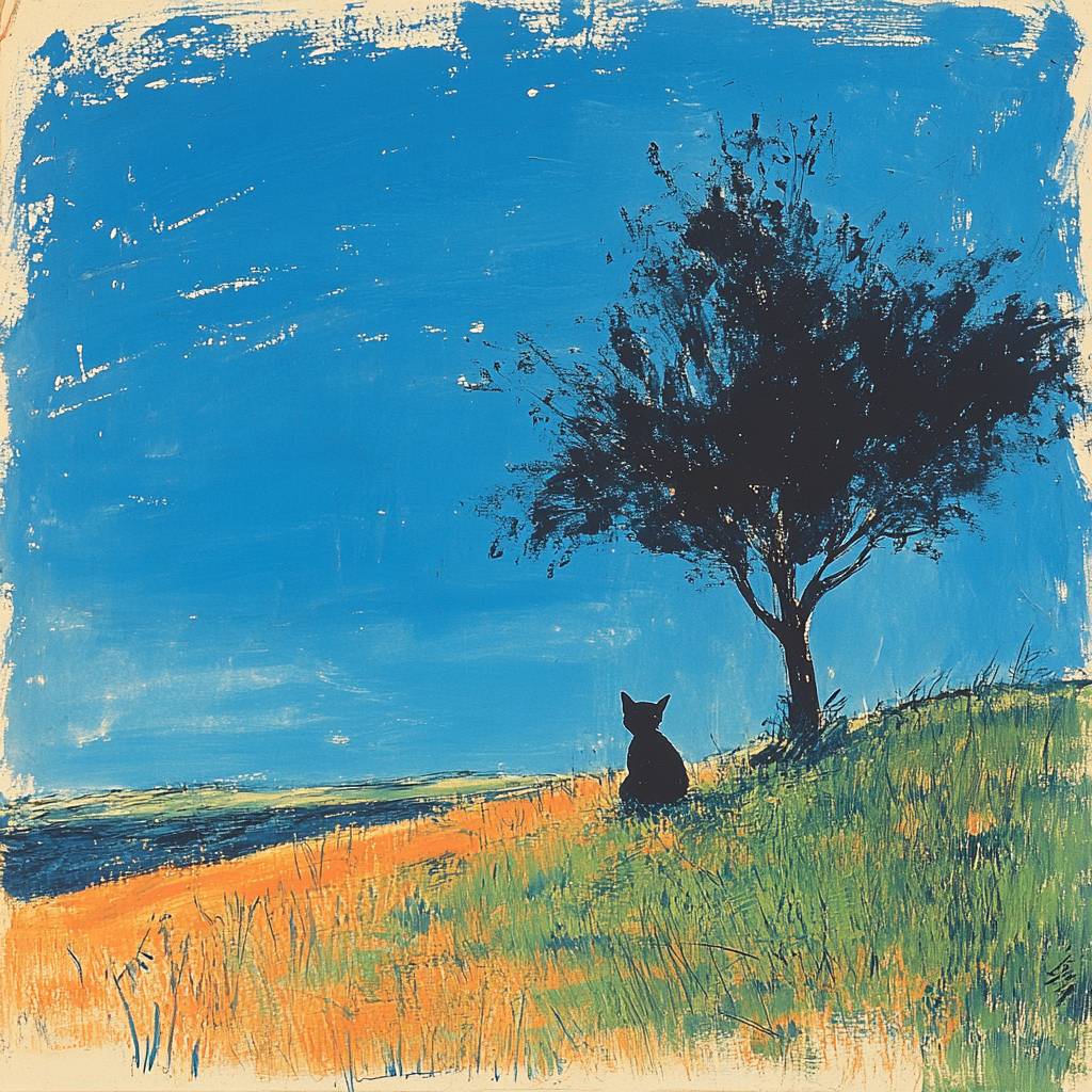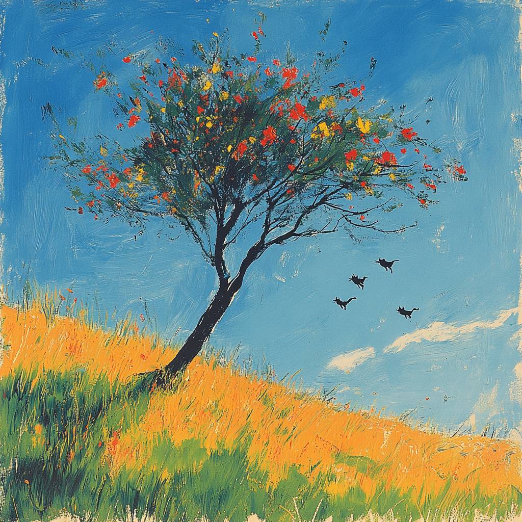 Trees and grassland, cats running, blue sky.