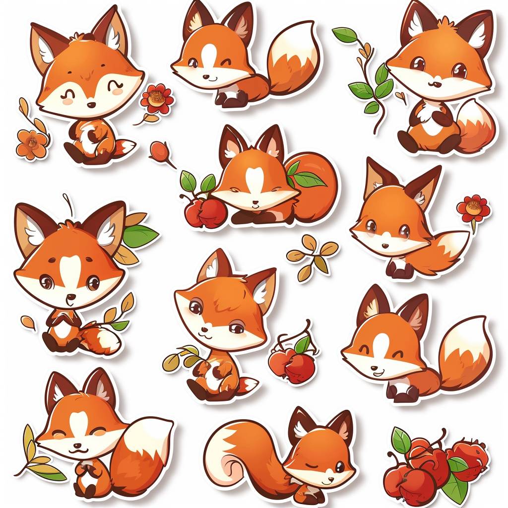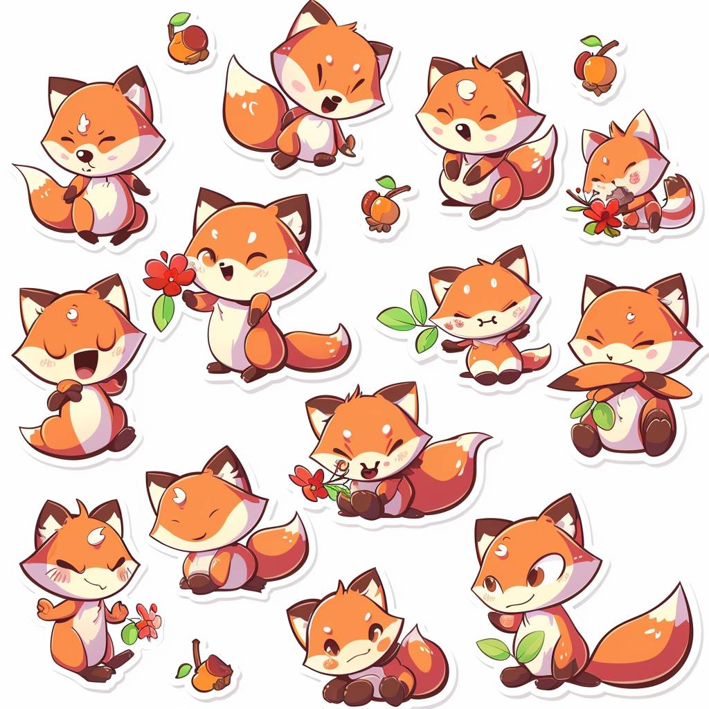 A set of red fox emoticons, flower-shaped tails and holding acorns and berries in various poses with cute expressions. Cute chibi style with a simple white background design. Sticker set, sticker sheet template --v 6.0