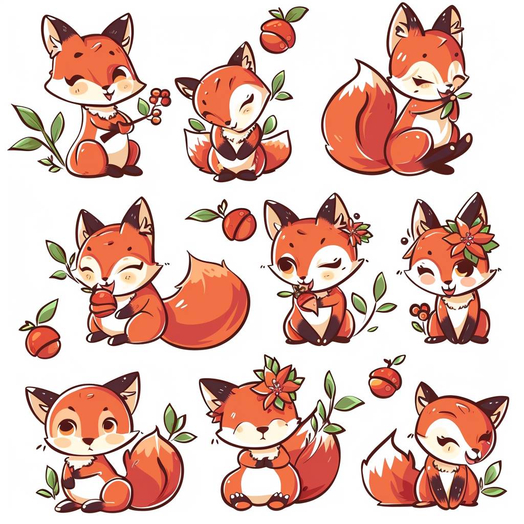 A set of red fox emoticons, flower-shaped tails, and holding acorns and berries in various poses with cute expressions. Cute chibi style with a simple white background design. Sticker set, sticker sheet template.
